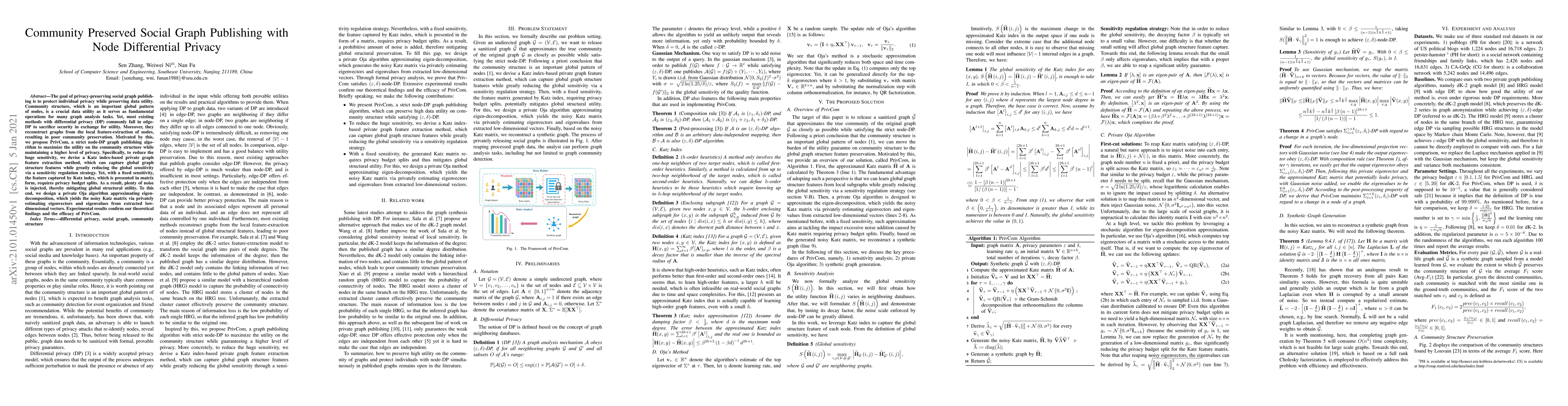 The paper proposes PrivCom, a node-differential privacy algorithm for publishing social graphs that preserves community structures while maintaining high privacy. It introduces a Katz index-based method to extract global graph features with reduced sensitivity and a private Oja algorithm to approximate eigen-decomposition, balancing privacy and utility.