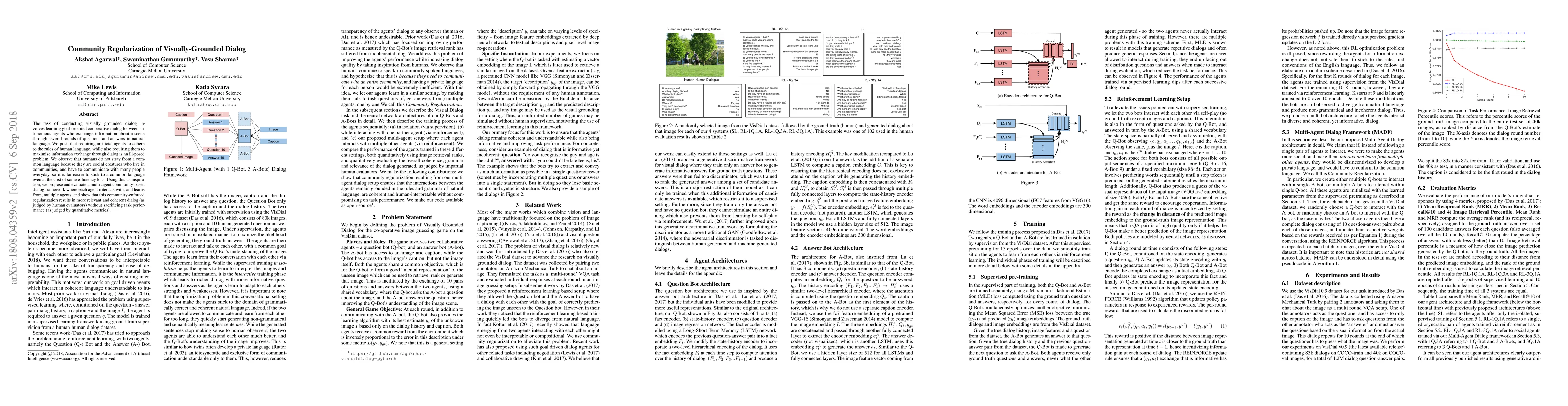 This paper proposes a community-based framework for visually grounded dialog, arguing that community regularization leads to more coherent and relevant dialog among agents. The approach involves agents interacting with multiple peers, resulting in improved dialog quality without compromising task performance.