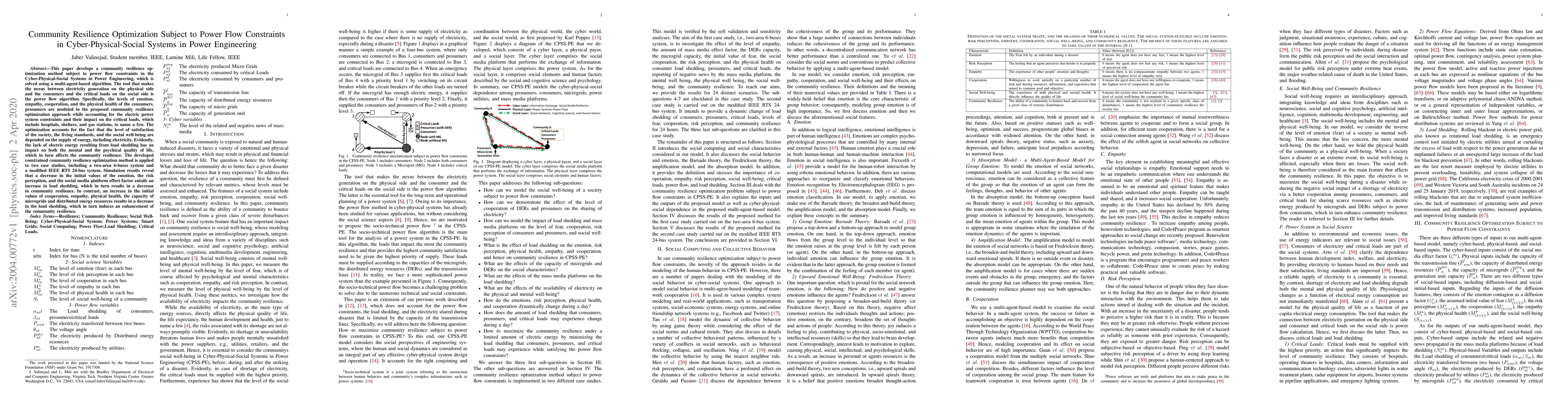 This paper develops a community resilience optimization method subject to power flow constraints in the Cyber-Physical-Social Systems in Power Engineering, which is solved using a multi-agent-based algorithm. The tool that makes the nexus between electricity generation on the physical side and the consumers and the critical loads on the social side is the power flow algorithm. Specifically, the levels of emotion, empathy, cooperation, and the physical health of the consumers, prosumers are modeled in the proposed community resilience optimization approach while accounting for the electric power system constraints and their impact on the critical loads, which include hospitals, shelters, and gas stations, to name a few. The optimization accounts for the fact that the level of satisfaction of the society, the living standards, and the social well-being are depended on the supply of energy, including electricity. Evidently, the lack of electric energy resulting from load shedding has an impact on both the mental and the psychical quality of life, which in turn affects the community resilience. The developed constrained community resilience optimization method is applied to two case studies, including a two-area 6-buses system and a modified IEEE RTS 24-bus system. Simulation results reveal that a decrease in the initial values of the emotion, the risk perception, and the social media platform effect factor entails an increase in load shedding, which in turn results in a decrease in community resilience. In contrast, an increase in the initial values of cooperation, empathy, physical health, the capacity of microgrids and distributed energy resources results in a decrease in the load shedding, which in turn induces an enhancement of the community resilience.