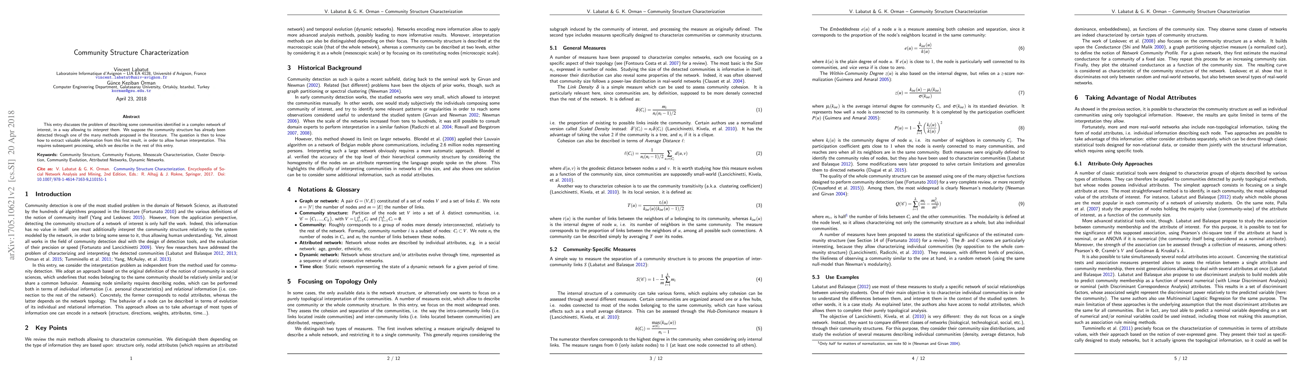 This entry discusses the problem of describing some communities identified in a complex network of interest, in a way allowing to interpret them. We suppose the community structure has already been detected through one of the many methods proposed in the literature. The question is then to know how to extract valuable information from this first result, in order to allow human interpretation. This requires subsequent processing, which we describe in the rest of this entry.