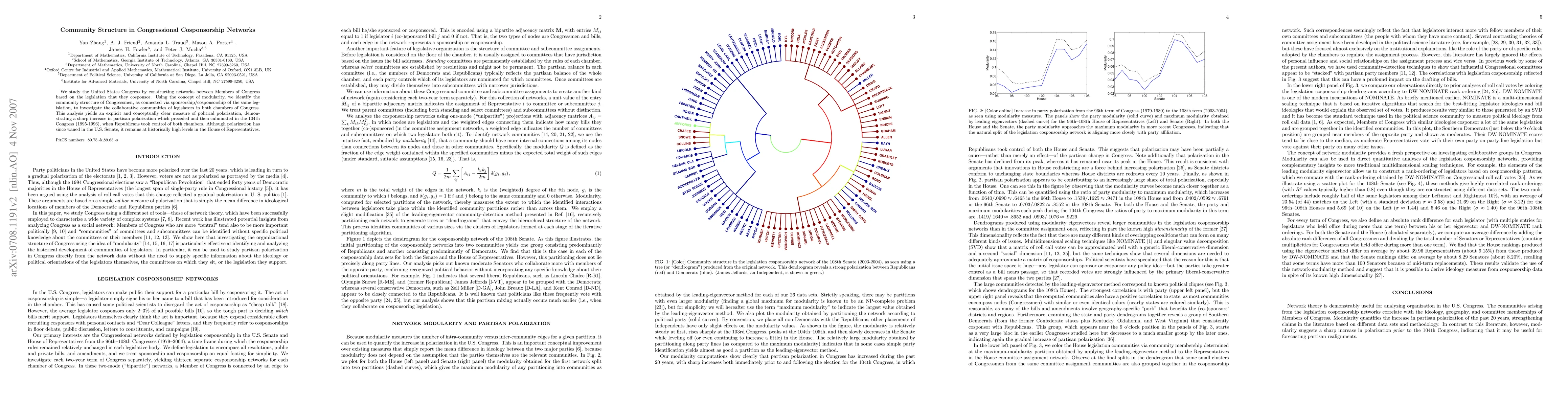 This study constructs cosponsorship networks among U.S. Congress members to identify community structures based on legislation cosponsorship, revealing a significant increase in partisan polarization preceding the 104th Congress, with polarization remaining high in the House despite a decline in the Senate.