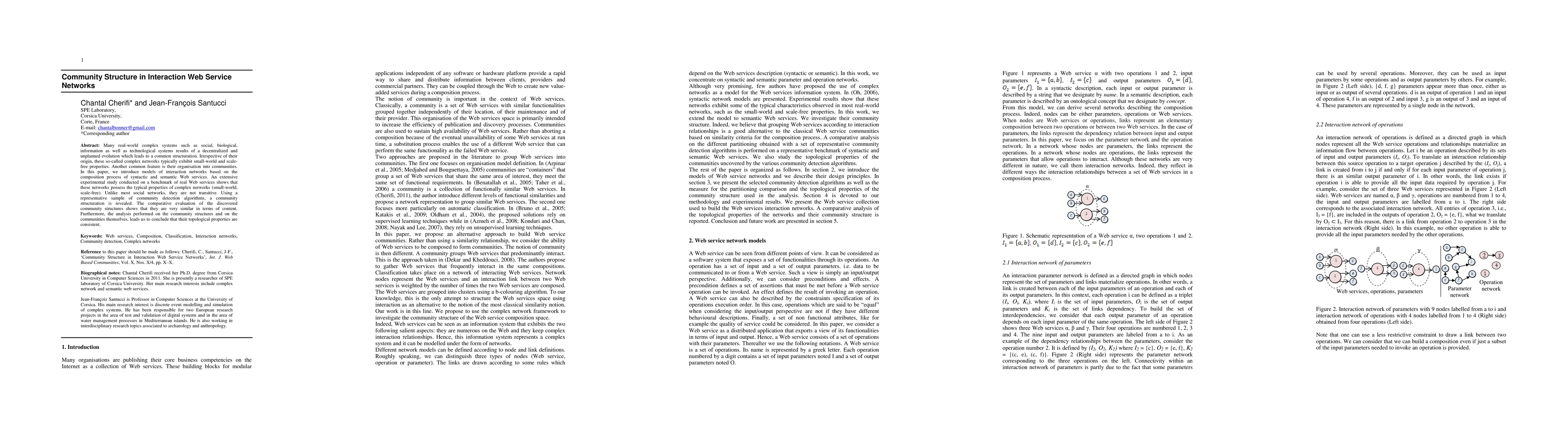Many real-world complex systems such as social, biological, information as well as technological systems results of a decentralized and unplanned evolution which leads to a common structuration. Irrespective of their origin, these so-called complex networks typically exhibit small-world and scale-free properties. Another common feature is their organisation into communities. In this paper, we introduce models of interaction networks based on the composition process of syntactic and semantic Web services. An extensive experimental study conducted on a benchmark of real Web services shows that these networks possess the typical properties of complex networks (small-world, scale-free). Unlike most social networks, they are not transitive. Using a representative sample of community detection algorithms, a community structuration is revealed. The comparative evaluation of the discovered community structures shows that they are very similar in terms of content. Furthermore, the analysis performed on the community structures and on the communities themselves, leads us to conclude that their topological properties are consistent.