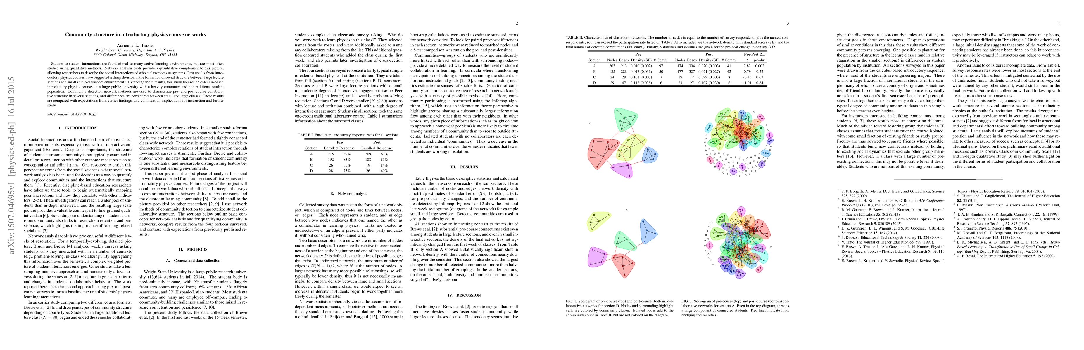 Student-to-student interactions are foundational to many active learning environments, but are most often studied using qualitative methods. Network analysis tools provide a quantitative complement to this picture, allowing researchers to describe the social interactions of whole classrooms as systems. Past results from introductory physics courses have suggested a sharp division in the formation of social structure between large lecture sections and small studio classroom environments. Extending those results, this study focuses on calculus-based introductory physics courses at a large public university with a heavily commuter and nontraditional student population. Community detection network methods are used to characterize pre- and post-course collaborative structure in several sections, and differences are considered between small and large classes. These results are compared with expectations from earlier findings, and comment on implications for instruction and further study.