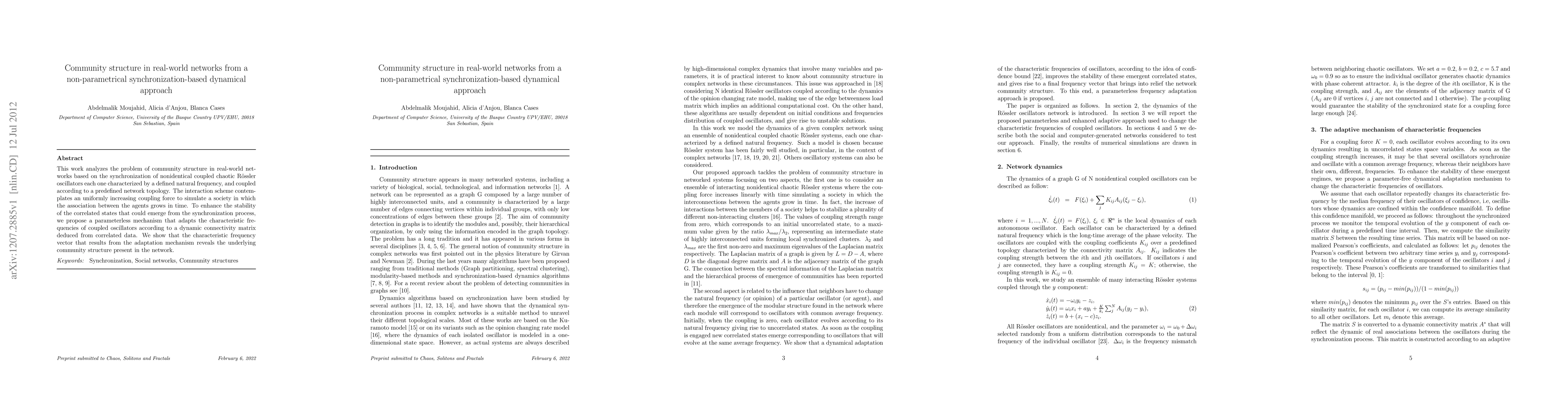 This work analyzes the problem of community structure in real-world networks based on the synchronization of nonidentical coupled chaotic R\"{o}ssler oscillators each one characterized by a defined natural frequency, and coupled according to a predefined network topology. The interaction scheme contemplates an uniformly increasing coupling force to simulate a society in which the association between the agents grows in time. To enhance the stability of the correlated states that could emerge from the synchronization process, we propose a parameterless mechanism that adapts the characteristic frequencies of coupled oscillators according to a dynamic connectivity matrix deduced from correlated data. We show that the characteristic frequency vector that results from the adaptation mechanism reveals the underlying community structure present in the network.