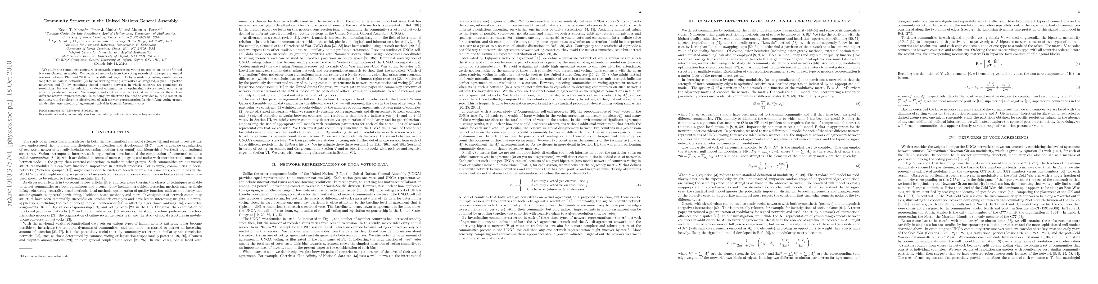 We study the community structure of networks representing voting on resolutions in the United Nations General Assembly. We construct networks from the voting records of the separate annual sessions between 1946 and 2008 in three different ways: (1) by considering voting similarities as weighted unipartite networks; (2) by considering voting similarities as weighted, signed unipartite networks; and (3) by examining signed bipartite networks in which countries are connected to resolutions. For each formulation, we detect communities by optimizing network modularity using an appropriate null model. We compare and contrast the results that we obtain for these three different network representations. In so doing, we illustrate the need to consider multiple resolution parameters and explore the effectiveness of each network representation for identifying voting groups amidst the large amount of agreement typical in General Assembly votes.