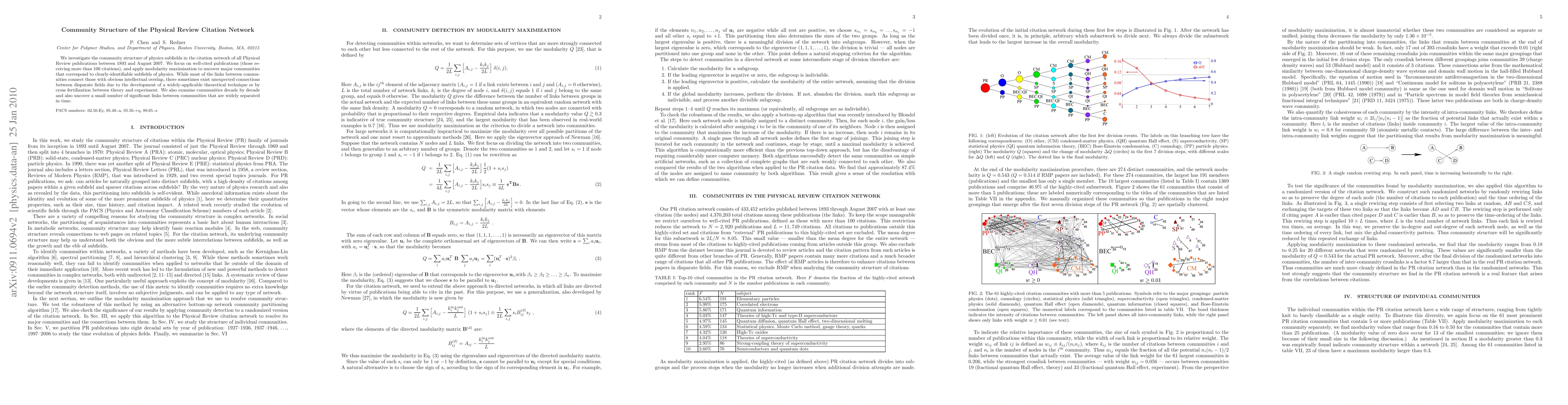 We investigate the community structure of physics subfields in the citation network of all Physical Review publications between 1893 and August 2007. We focus on well-cited publications (those receiving more than 100 citations), and apply modularity maximization to uncover major communities that correspond to clearly-identifiable subfields of physics. While most of the links between communities connect those with obvious intellectual overlap, there sometimes exist unexpected connections between disparate fields due to the development of a widely-applicable theoretical technique or by cross fertilization between theory and experiment. We also examine communities decade by decade and also uncover a small number of significant links between communities that are widely separated in time.