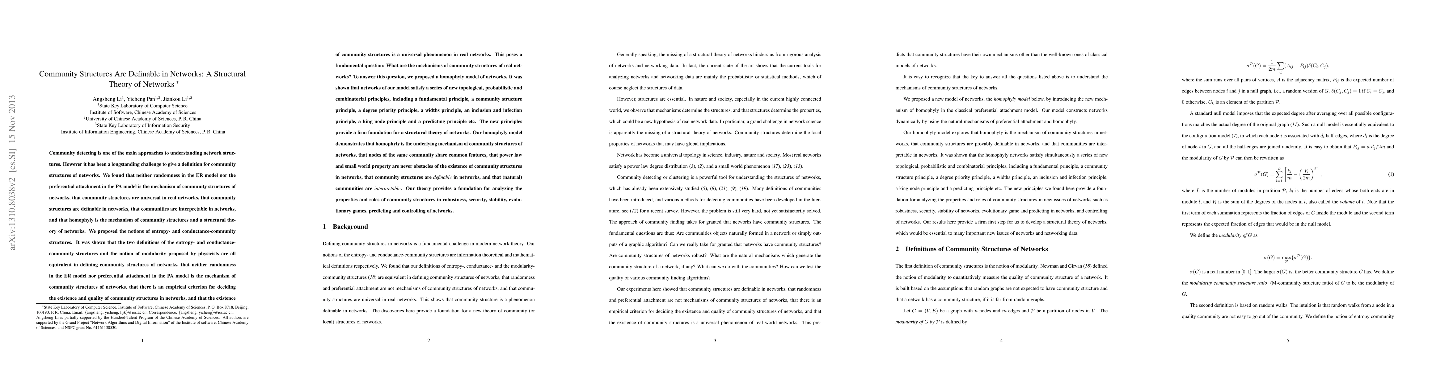 We found that neither randomness in the ER model nor the preferential attachment in the PA model is the mechanism of community structures of networks, that community structures are universal in real networks, that community structures are definable in networks, that communities are interpretable in networks, and that homophyly is the mechanism of community structures and a structural theory of networks. We proposed the notions of entropy- and conductance-community structures. It was shown that the two definitions of the entropy- and conductance-community structures and the notion of modularity proposed by physicists are all equivalent in defining community structures of networks, that neither randomness in the ER model nor preferential attachment in the PA model is the mechanism of community structures of networks, and that the existence of community structures is a universal phenomenon in real networks. This poses a fundamental question: What are the mechanisms of community structures of real networks? To answer this question, we proposed a homophyly model of networks. It was shown that networks of our model satisfy a series of new topological, probabilistic and combinatorial principles, including a fundamental principle, a community structure principle, a degree priority principle, a widths principle, an inclusion and infection principle, a king node principle and a predicting principle etc. The new principles provide a firm foundation for a structural theory of networks. Our homophyly model demonstrates that homophyly is the underlying mechanism of community structures of networks, that nodes of the same community share common features, that power law and small world property are never obstacles of the existence of community structures in networks, that community structures are {\it definable} in networks, and that (natural) communities are {\it interpretable}.