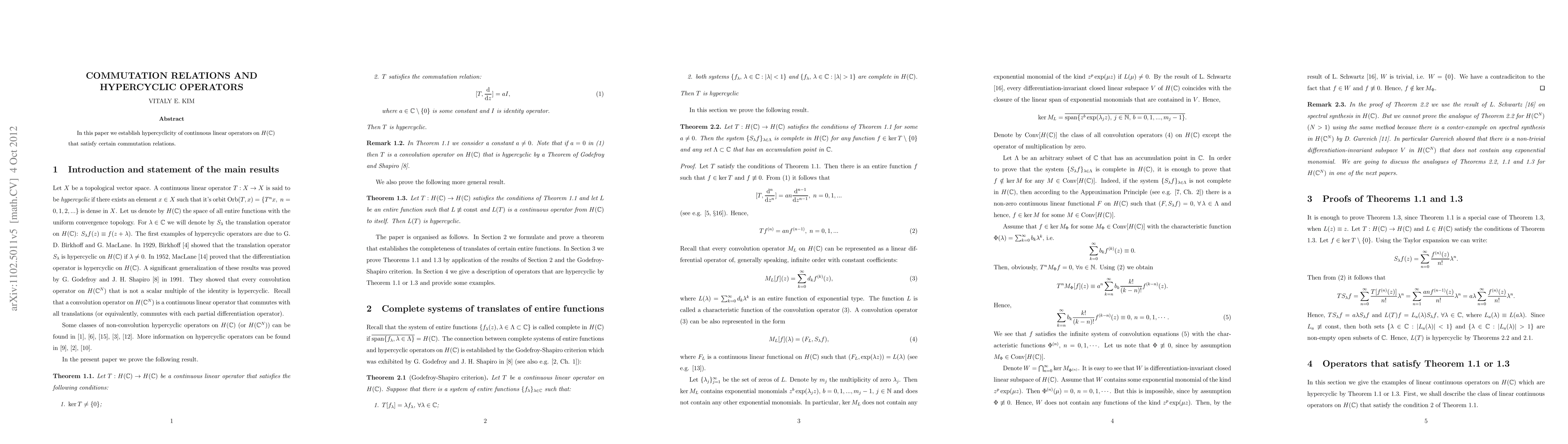 Summary: This paper demonstrates the hypercyclicity of continuous linear operators on the space of holomorphic functions on the complex plane, provided they meet specific commutation relation criteria. Hypercyclic operators are shown to exhibit extensive dynamical behavior.