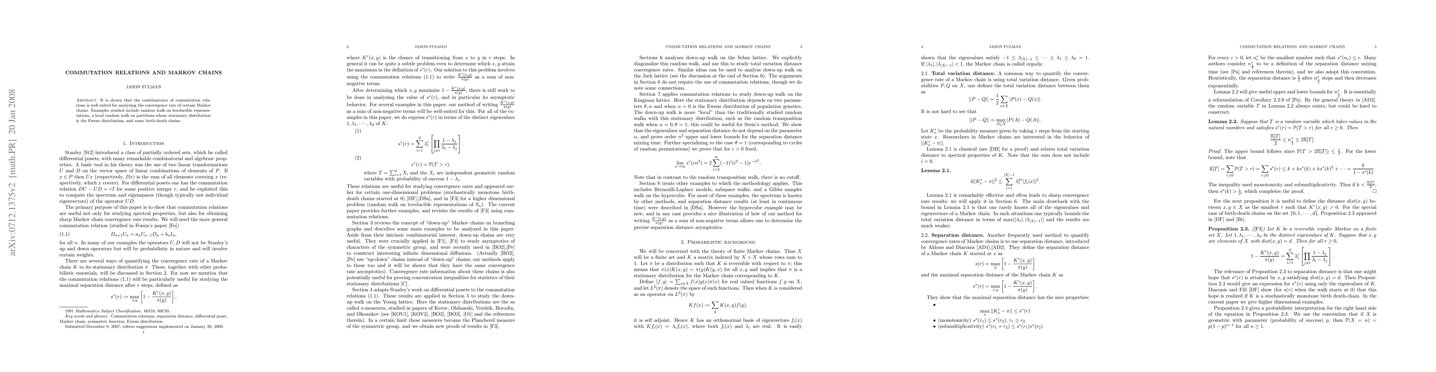 This paper demonstrates how the combinatorics of commutation relations can effectively analyze the convergence rate of specific Markov chains, including random walks on irreducible representations and local random walks on partitions with Ewens distribution. The study also extends to birth-death chains.
