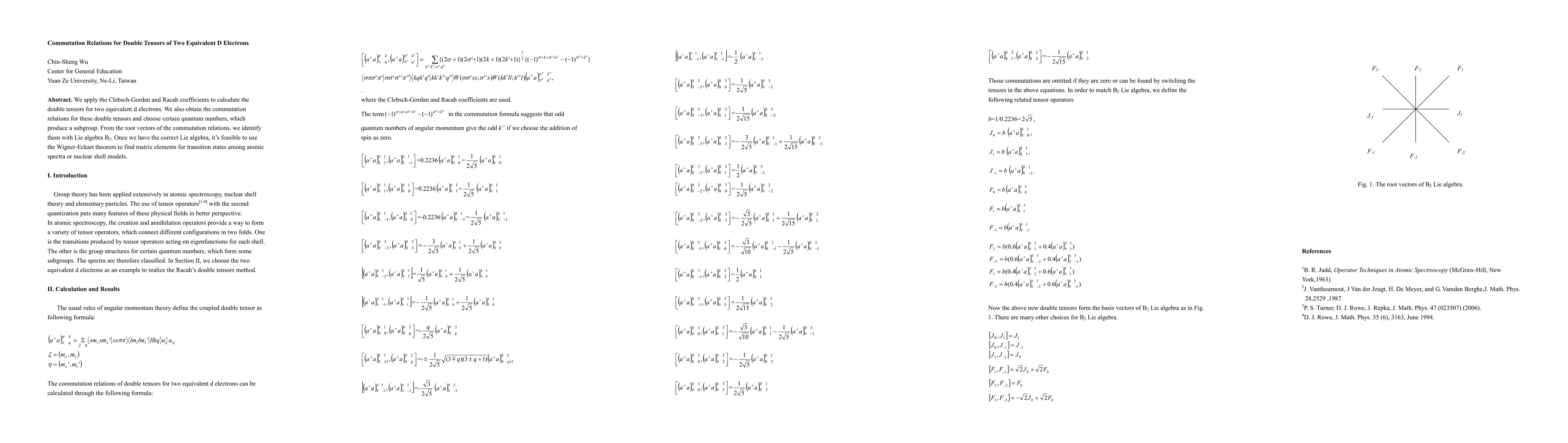 This paper calculates double tensors for two equivalent d electrons using Clebsch-Gordan and Racah coefficients, derives commutation relations, and identifies them with Lie algebra B2, enabling the application of the Wigner-Eckart theorem for atomic spectra or nuclear shell models.