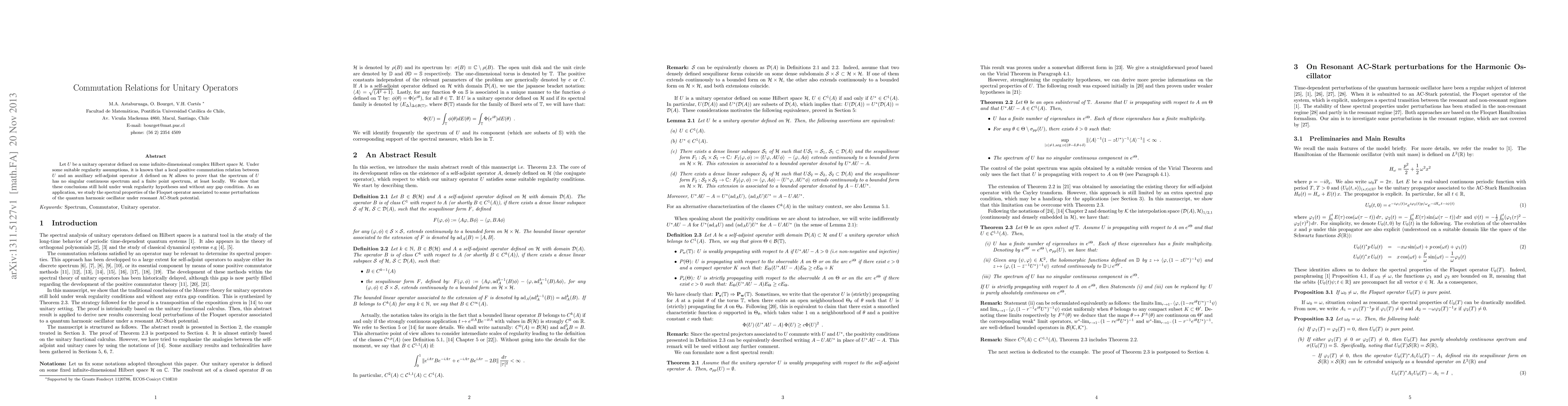This paper demonstrates that local positive commutation relations between a unitary operator $U$ and a self-adjoint operator $A$ imply the absence of singular continuous spectrum and finite point spectrum for $U$, even under weak regularity conditions. The findings are applied to analyze the spectral properties of the Floquet operator in perturbed quantum harmonic oscillators under resonant AC-Stark potentials.
