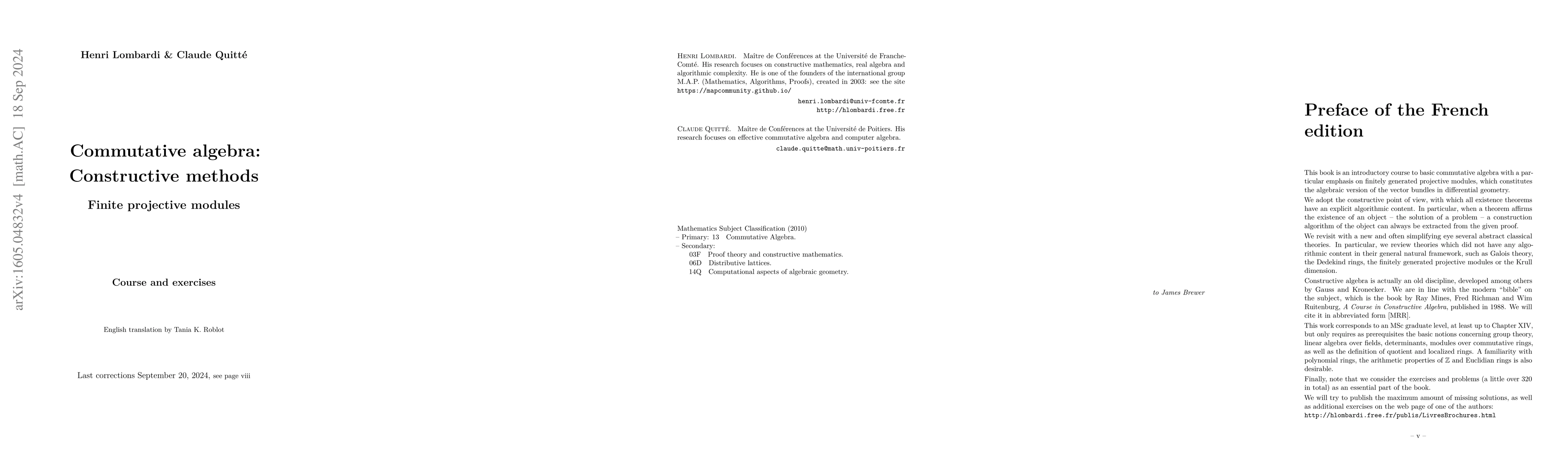 This book provides a constructive approach to basic commutative algebra, focusing on finitely generated projective modules with explicit algorithmic methods for solving problems.