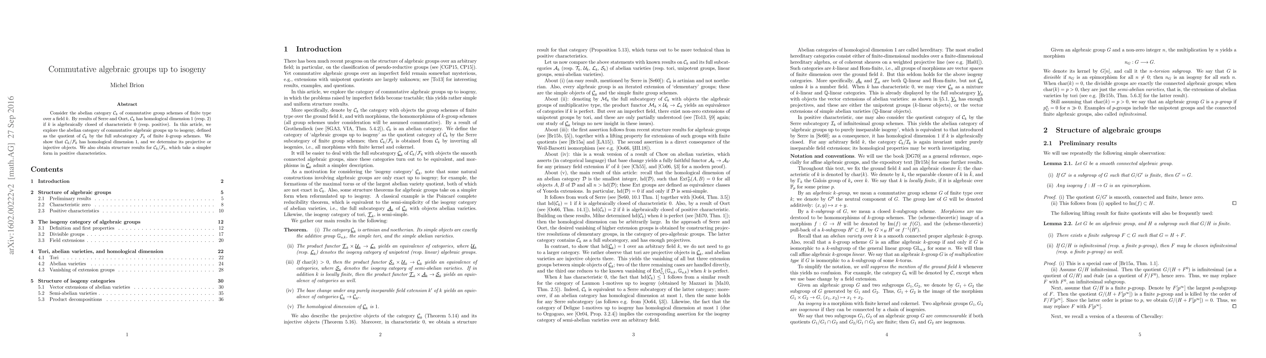 This paper investigates the abelian category of commutative algebraic groups up to isogeny, showing it has homological dimension 1 and determining its projective and injective objects. The results are simpler in positive characteristics compared to characteristic 0.