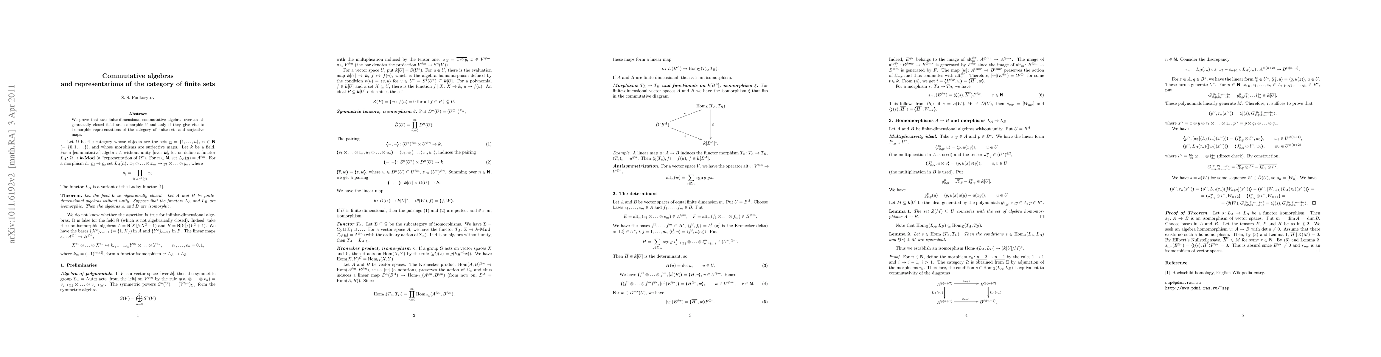 Two finite-dimensional commutative algebras over an algebraically closed field are isomorphic if they give rise to isomorphic representations of the category of finite sets and surjective maps.