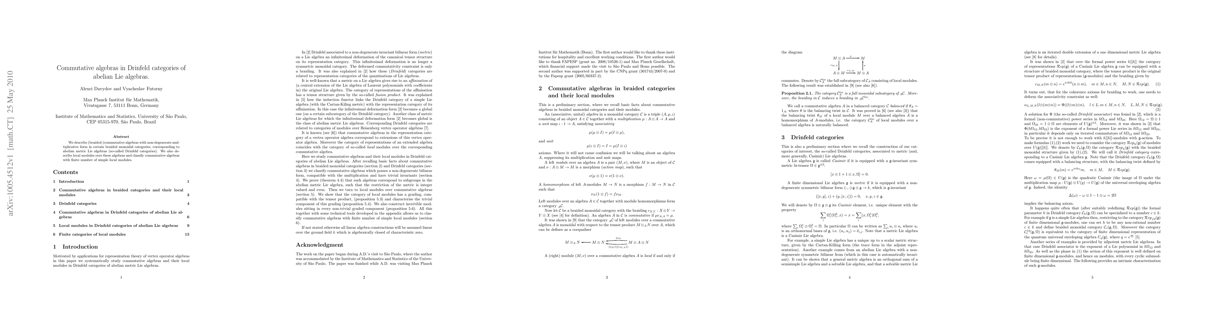 The paper explores commutative algebras in Drinfeld categories associated with abelian metric Lie algebras, focusing on their non-degenerate multiplicative forms, local modules, and classification based on the number of simple local modules. The study provides insights into the structure of these algebras within braided monoidal categories.