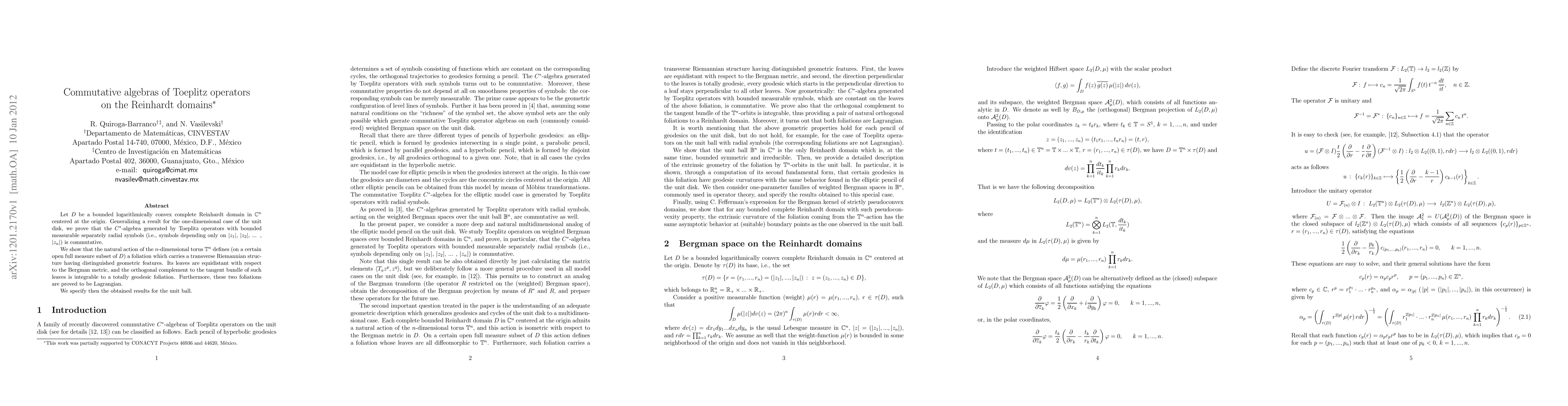 Let $D$ be a bounded logarithmically convex complete Reinhardt domain in $\mathbb{C}^n$ centered at the origin. Generalizing a result for the one-dimensional case of the unit disk, we prove that the $C^*$-algebra generated by Toeplitz operators with bounded measurable separately radial symbols (i.e., symbols depending only on $|z_1|$, $|z_2|$, ..., $|z_n|$) is commutative. We show that the natural action of the $n$-dimensional torus $\mathbb{T}^n$ defines (on a certain open full measure subset of $D$) a foliation which carries a transverse Riemannian structure having distinguished geometric features. Its leaves are equidistant with respect to the Bergman metric, and the orthogonal complement to the tangent bundle of such leaves is integrable to a totally geodesic foliation. Furthermore, these two foliations are proved to be Lagrangian. We specify then the obtained results for the unit ball.