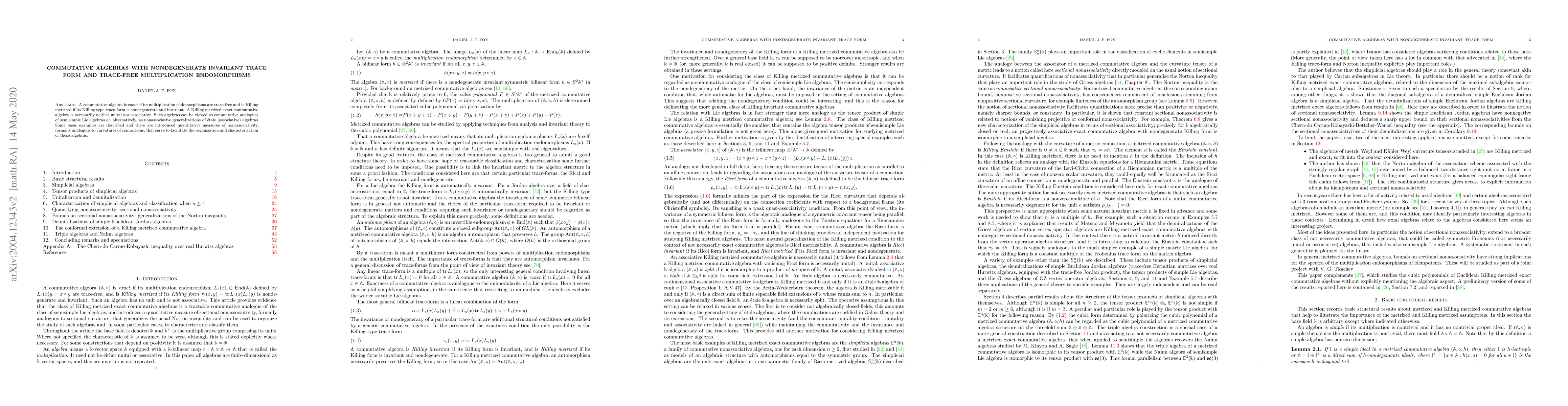 A commutative algebra is exact if its multiplication endomorphisms are trace-free and is Killing metrized if its Killing type trace-form is nondegenerate and invariant. A Killing metrized exact commutative algebra is necessarily neither unital nor associative. Such algebras can be viewed as commutative analogues of semisimple Lie algebras or, alternatively, as nonassociative generalizations of \'etale (associative) algebras. Some basic examples are described and there are introduced quantitative measures of nonassociativity, formally analogous to curvatures of connections, that serve to facilitate the organization and characterization of these algebras.