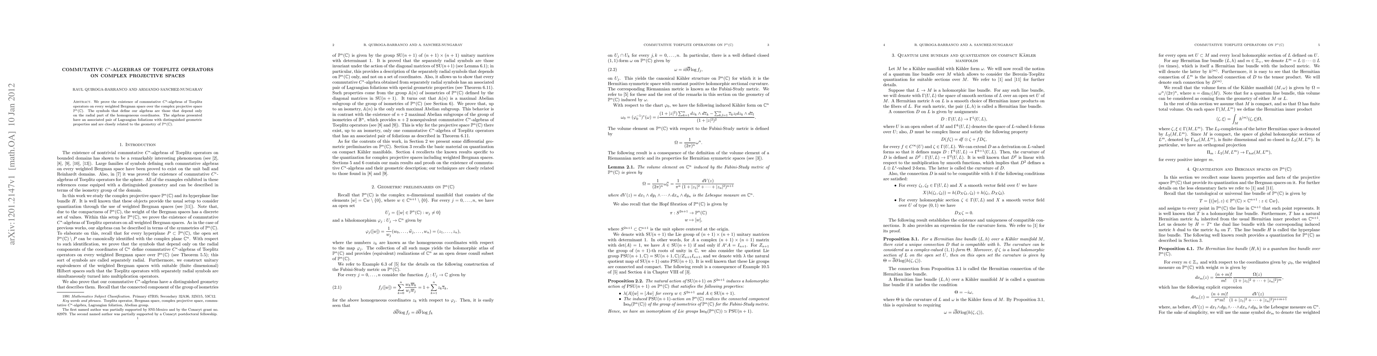 Researchers prove the existence of commutative $C^*$-algebras of Toeplitz operators on every weighted Bergman space over complex projective spaces $b{P}^n(b{C})$, with symbols depending only on radial coordinates, and associating them to specific geometric properties.