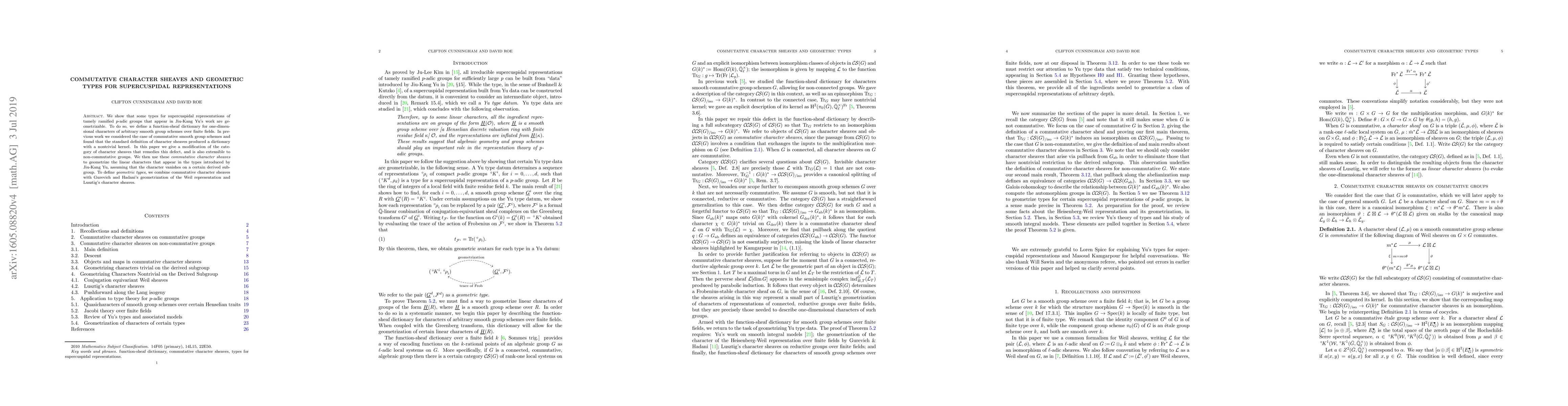 We show that some types for supercuspidal representations of tamely ramified $p$-adic groups that appear in Jiu-Kang Yu's work are geometrizable. To do so, we define a function-sheaf dictionary for one-dimensional characters of arbitrary smooth group schemes over finite fields. In previous work we considered the case of commutative smooth group schemes and found that the standard definition of character sheaves produced a dictionary with a nontrivial kernel. In this paper we give a modification of the category of character sheaves that remedies this defect, and is also extensible to non-commutative groups. We then use these commutative character sheaves to geometrize the linear characters that appear in the types introduced by Jiu-Kang Yu, assuming that the character vanishes on a certain derived subgroup. To define geometric types, we combine commutative character sheaves with Gurevich and Hadani's geometrization of the Weil representation and Lusztig's character sheaves.