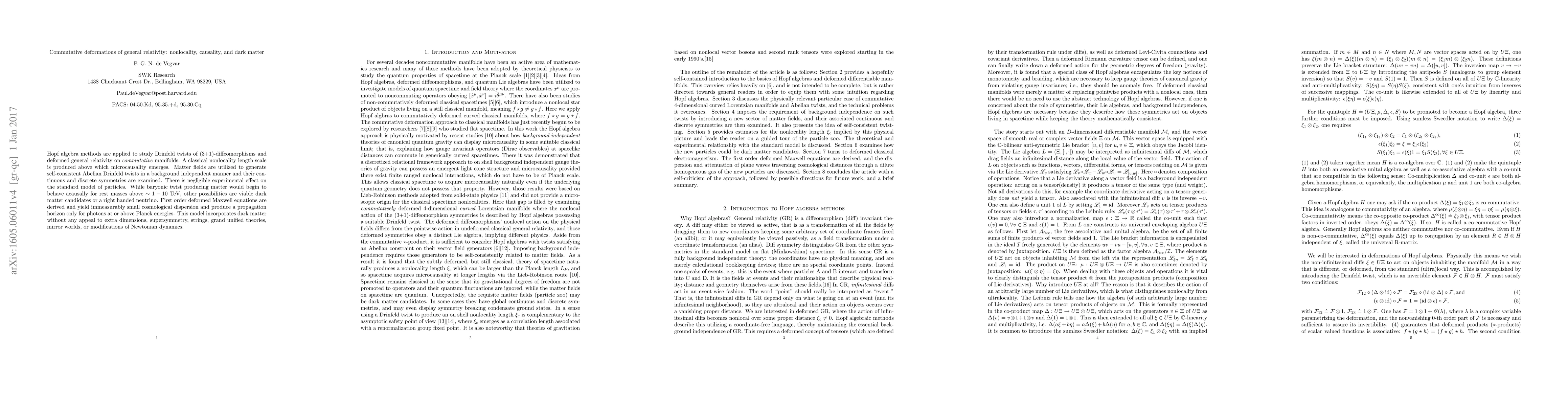 Hopf algebra methods are applied to study Drinfeld twists of (3+1)-diffeomorphisms and deformed general relativity on \emph{commutative} manifolds. A classical nonlocality length scale is produced above which microcausality emerges. Matter fields are utilized to generate self-consistent Abelian Drinfeld twists in a background independent manner and their continuous and discrete symmetries are examined. There is negligible experimental effect on the standard model of particles. While baryonic twist producing matter would begin to behave acausally for rest masses above $\sim1-10$ TeV, other possibilities are viable dark matter candidates or a right handed neutrino. First order deformed Maxwell equations are derived and yield immeasurably small cosmological dispersion and produce a propagation horizon only for photons at or above Planck energies. This model incorporates dark matter without any appeal to extra dimensions, supersymmetry, strings, grand unified theories, mirror worlds, or modifications of Newtonian dynamics.