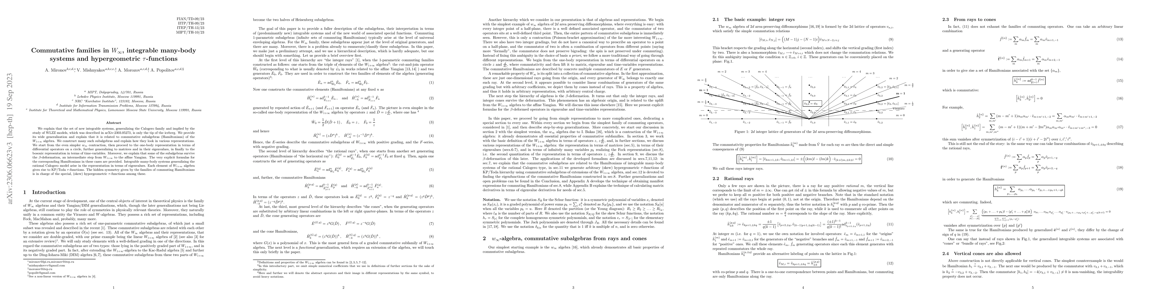 This paper generalizes integrable many-body systems beyond the Calogero family, linking them to commutative subalgebras of the $W_{1+\infty}$ algebra. It constructs various representations of these subalgebras, including the $w_\infty$ contraction, differential operators, and bosonic time-variables, and provides explicit Hamiltonians and $\tau$-functions, revealing hidden symmetries responsible for special hypergeometric $\tau$-functions.
