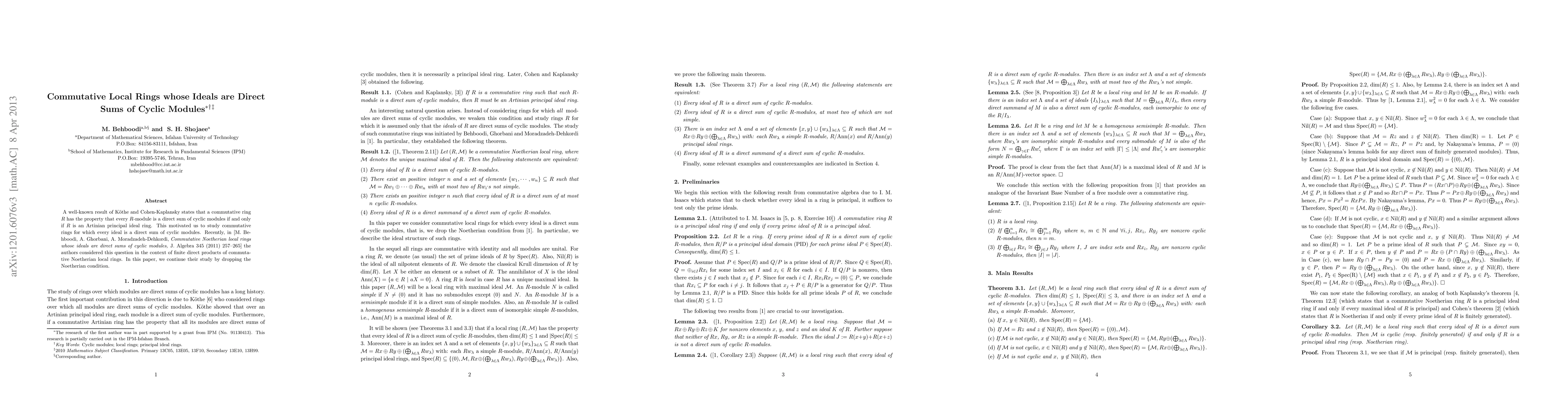 Summary: This paper explores commutative local rings where every ideal can be expressed as a direct sum of cyclic modules, extending prior work that considered Noetherian local rings. The authors aim to determine the structural properties of such rings without the Noetherian assumption.