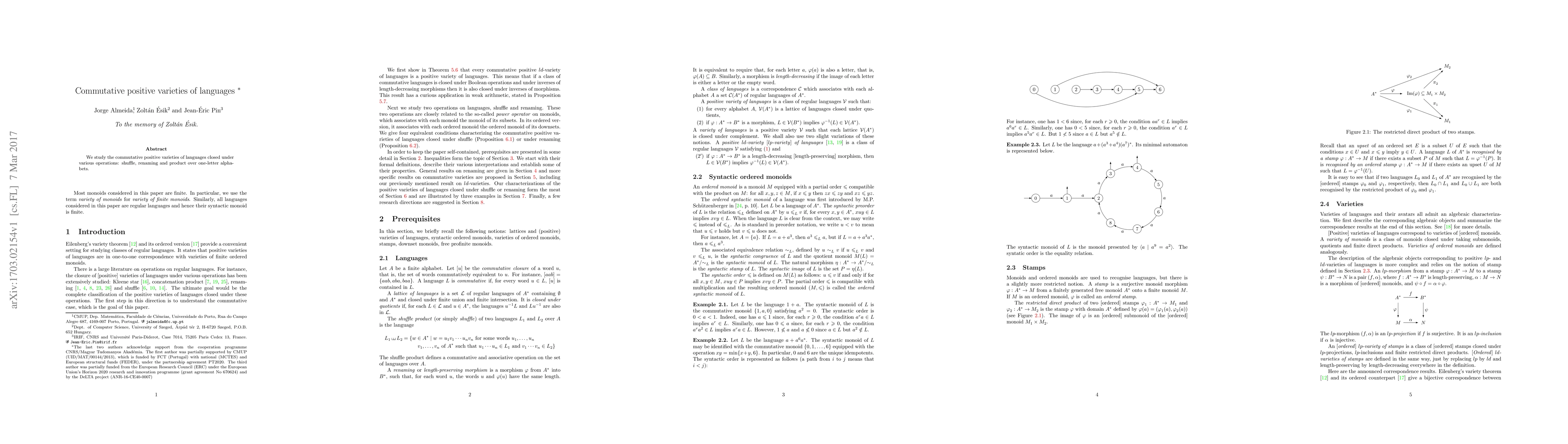 Summary: This paper investigates commutative positive varieties of languages, focusing on their closure under shuffle, renaming, and product operations over one-letter alphabets. The study aims to understand the structural properties of these language varieties.