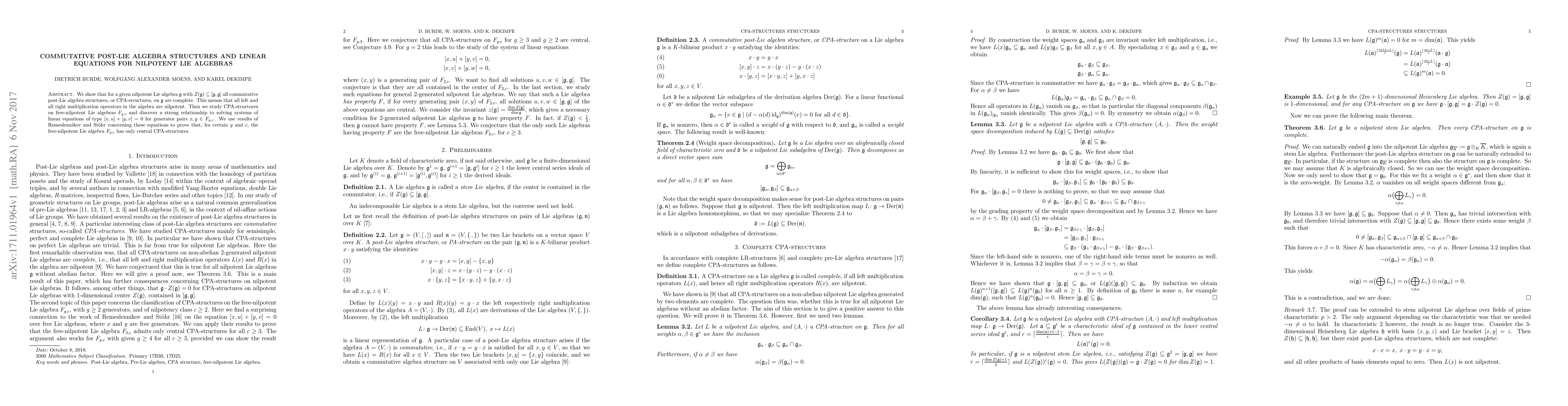 We show that for a given nilpotent Lie algebra $\mathfrak{g}$ with $Z(\mathfrak{g})\subseteq [\mathfrak{g},\mathfrak{g}]$ all commutative post-Lie algebra structures, or CPA-structures, on $\mathfrak{g}$ are complete. This means that all left and all right multiplication operators in the algebra are nilpotent. Then we study CPA-structures on free-nilpotent Lie algebras $F_{g,c}$ and discover a strong relationship to solving systems of linear equations of type $[x,u]+[y,v]=0$ for generator pairs $x,y\in F_{g,c}$. We use results of Remeslennikov and St\"ohr concerning these equations to prove that, for certain $g$ and $c$, the free-nilpotent Lie algebra $F_{g,c}$ has only central CPA-structures.