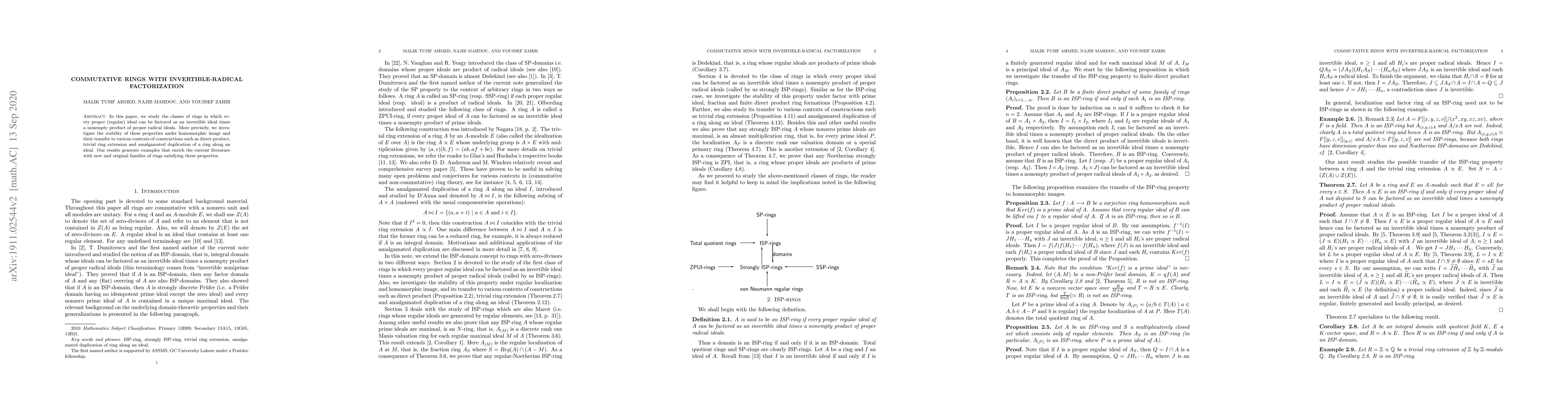 This paper explores commutative rings where every proper ideal factors into an invertible ideal and a product of radical ideals, investigating how these properties persist under various ring constructions and extensions. The study provides new examples of such rings, enriching the existing literature.