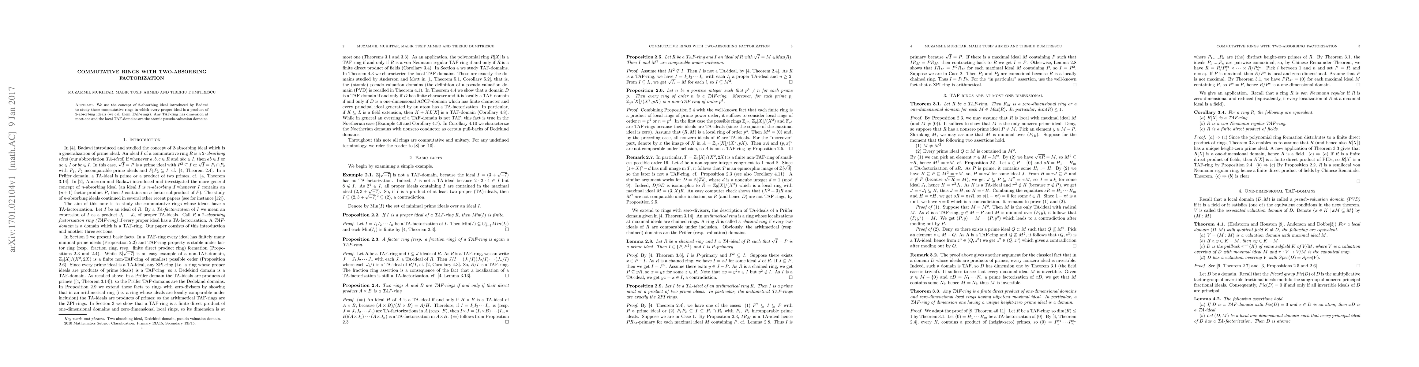Summary: This paper investigates commutative rings (TAF-rings) where each proper ideal can be expressed as a product of 2-absorbing ideals, showing they have a dimension of at most one, and identifies local TAF-domains as atomic pseudo-valuation domains.