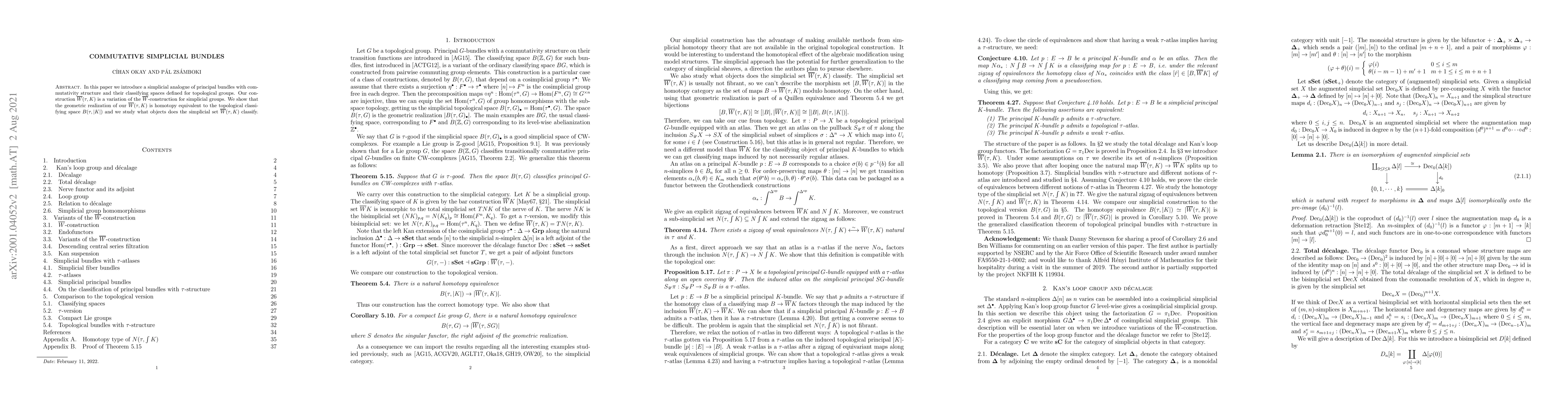 The paper constructs a simplicial analogue of commutative principal bundles and their classifying spaces for topological groups, demonstrating that the geometric realization of the proposed $\overline W(\tau,K)$ construction is homotopy equivalent to the classifying space $B(\tau,|K|)$. The study also explores the classification properties of the simplicial set $\overline W(\tau,K)$.