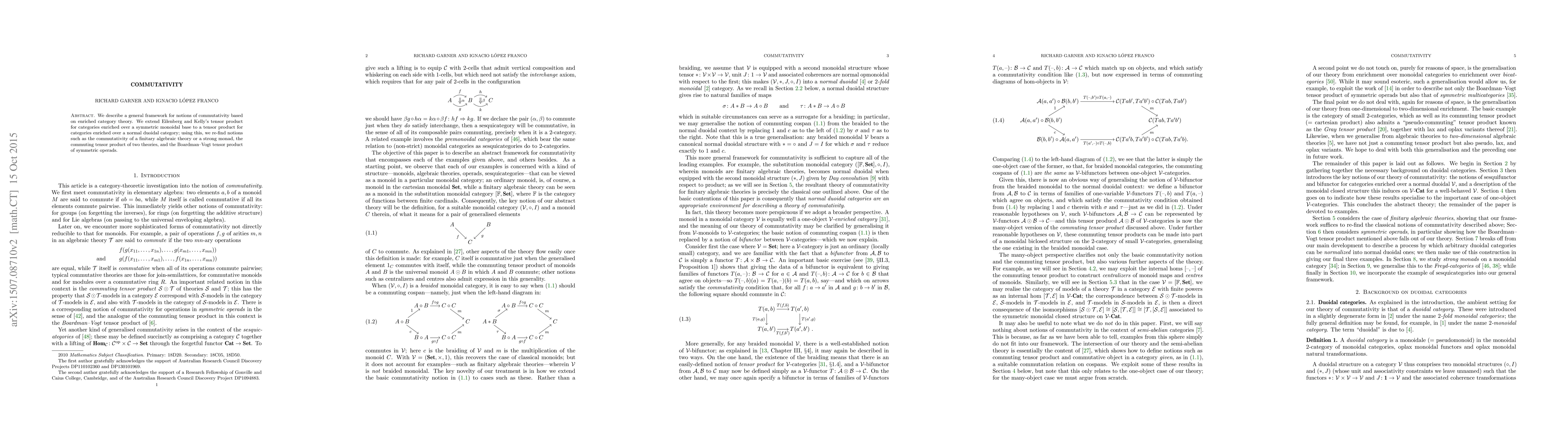 We describe a general framework for notions of commutativity based on enriched category theory. We extend Eilenberg and Kelly's tensor product for categories enriched over a symmetric monoidal base to a tensor product for categories enriched over a normal duoidal category; using this, we re-find notions such as the commutativity of a finitary algebraic theory or a strong monad, the commuting tensor product of two theories, and the Boardman-Vogt tensor product of symmetric operads.