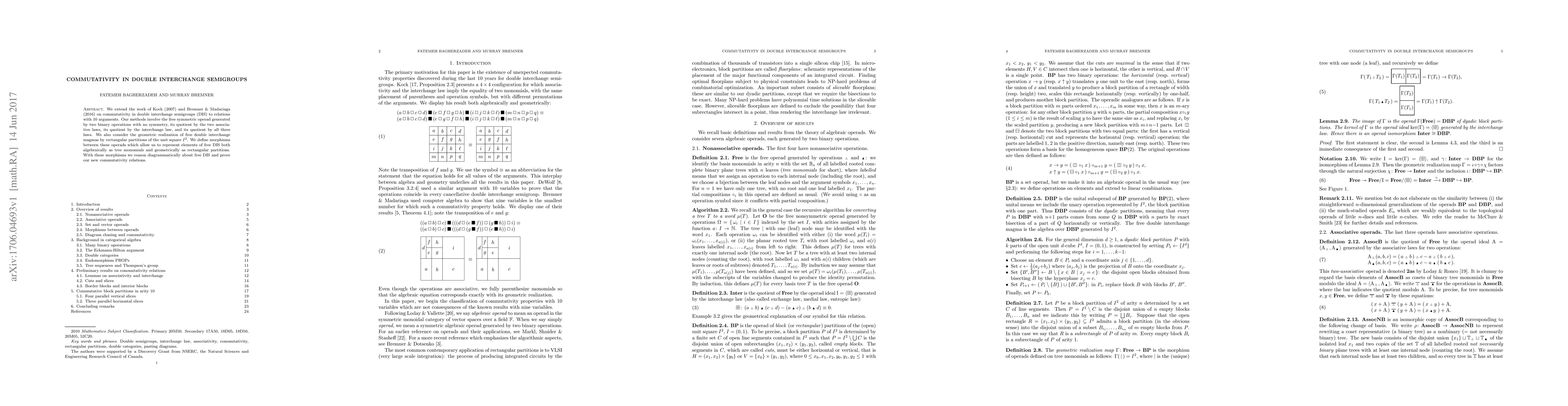 We extend the work of Kock (2007) and Bremner & Madariaga (2016) on commutativity in double interchange semigroups (DIS) to relations with 10 arguments. Our methods involve the free symmetric operad generated by two binary operations with no symmetry, its quotient by the two associative laws, its quotient by the interchange law, and its quotient by all three laws. We also consider the geometric realization of free double interchange magmas by rectangular partitions of the unit square $I^2$. We define morphisms between these operads which allow us to represent elements of free DIS both algebraically as tree monomials and geometrically as rectangular partitions. With these morphisms we reason diagrammatically about free DIS and prove our new commutativity relations.