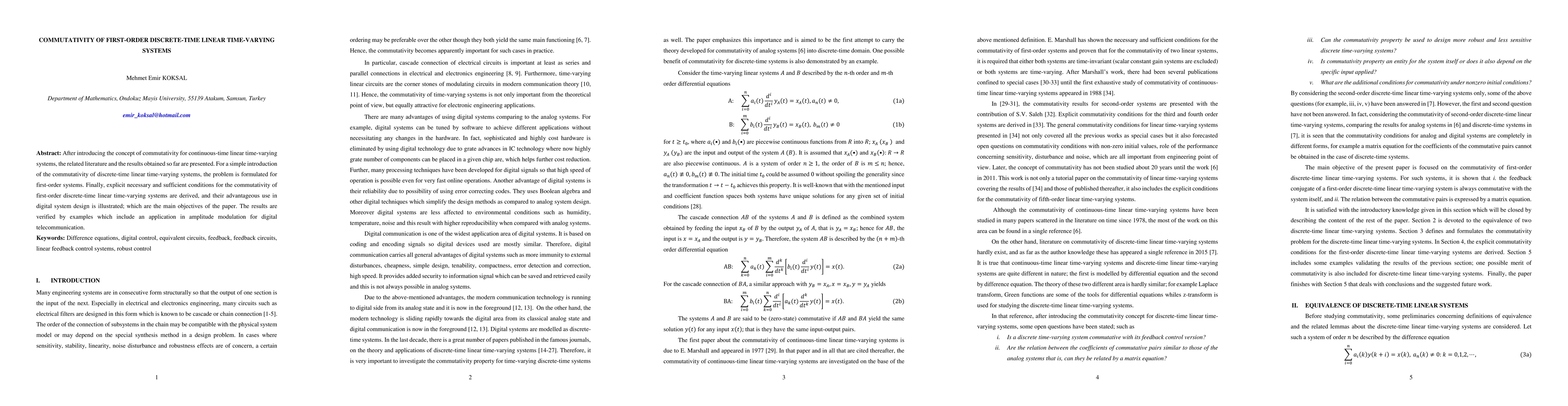 After introducing the concept of commutativity for continuous-time linear time-varying systems, the related literature and the results obtained so far are presented. For a simple introduction of the commutativity of discrete-time linear time-varying systems, the problem is formulated for first-order systems. Finally, explicit necessary and sufficient conditions for the commutativity of first-order discrete-time linear time-varying systems are derived, and their advantageous use in digital system design is illustrated; which are the main objectives of the paper. The results are verified by examples which include an application in amplitude modulation for digital telecommunication.