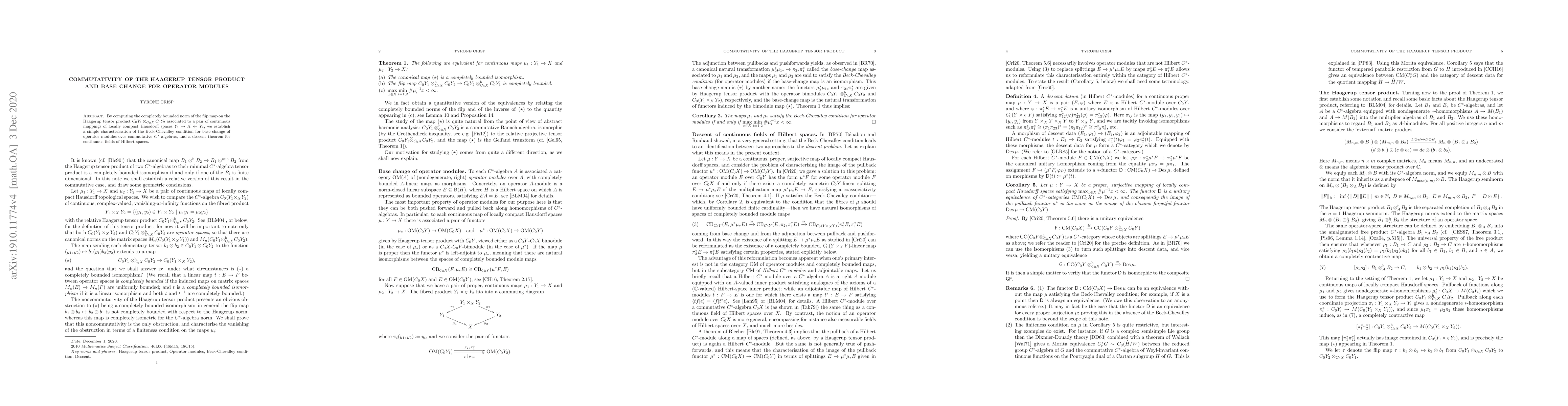 By computing the completely bounded norm of the flip map on the Haagerup tensor product $C_0 Y_1\otimes_{C_0 X} C_0 Y_2$ associated to a pair of continuous mappings of locally compact Hausdorff spaces $Y_1\rightarrow X\leftarrow Y_2$, we establish a simple characterisation of the Beck-Chevalley condition for base change of operator modules over commutative $C^*$-algebras, and a descent theorem for continuous fields of Hilbert spaces.