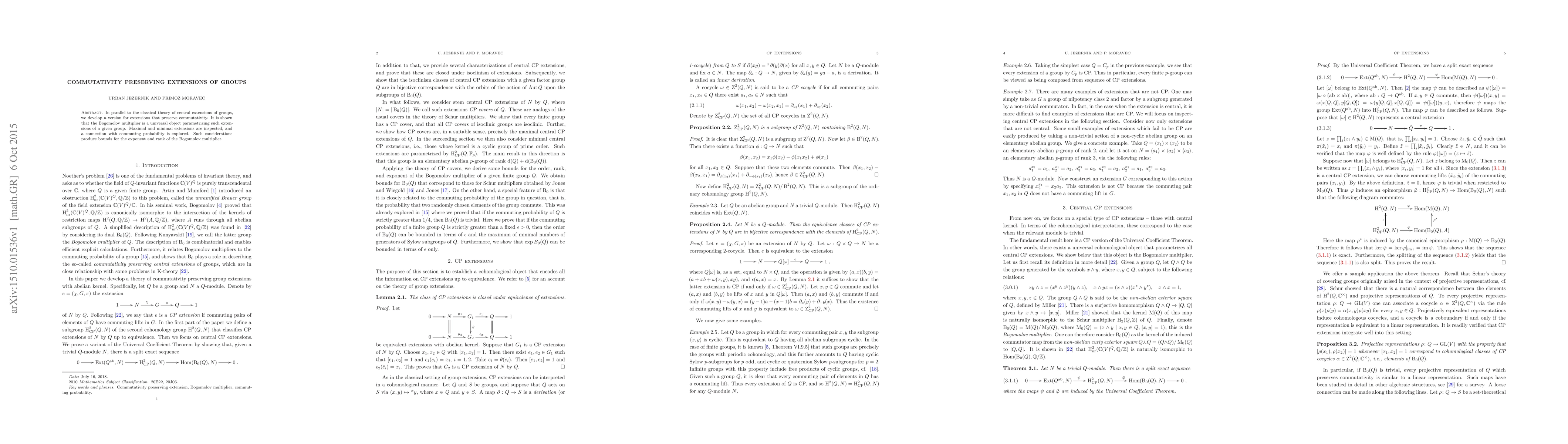 This paper develops a theory of commutativity preserving extensions of groups, showing that the Bogomolov multiplier universally parametrizes these extensions. It examines maximal and minimal extensions, explores their relation to commuting probability, and establishes bounds for the exponent and rank of the Bogomolov multiplier.