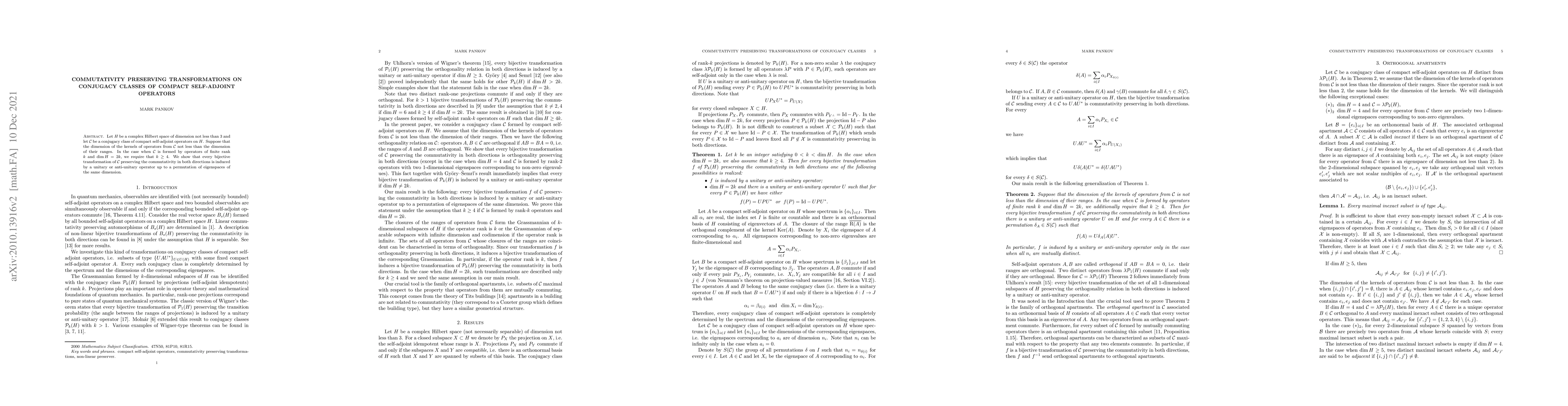 This paper investigates bijective transformations preserving commutativity on conjugacy classes of compact self-adjoint operators in complex Hilbert spaces. It demonstrates that such transformations are induced by unitary or anti-unitary operators, up to a permutation of eigenspaces, under specific dimensional conditions.