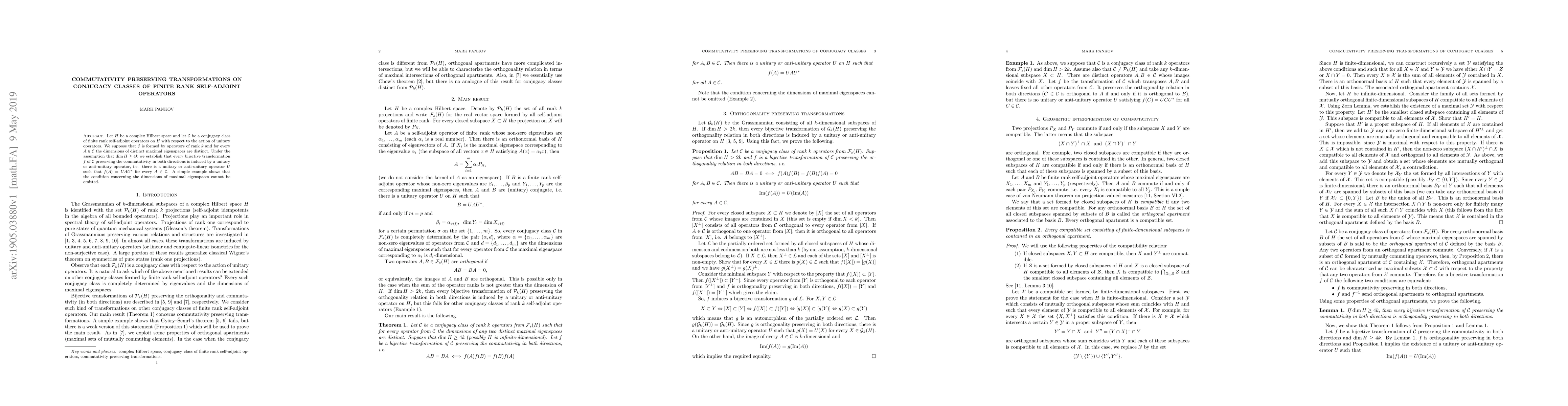 This paper investigates bijective transformations on conjugacy classes of finite rank self-adjoint operators on a complex Hilbert space, proving that such transformations preserving commutativity are induced by unitary or anti-unitary operators, provided the Hilbert space dimension is sufficiently large. An example demonstrates the necessity of the condition on distinct maximal eigenspace dimensions.