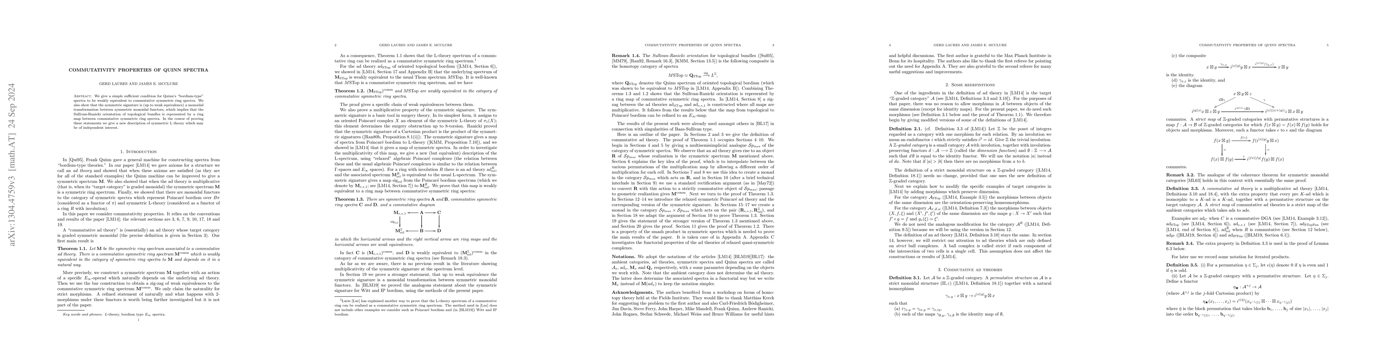 We give a simple sufficient condition for Quinn's "bordism-type" spectra to be weakly equivalent to commutative symmetric ring spectra. We also show that the symmetric signature is (up to weak equivalence) a monoidal transformation between symmetric monoidal functors, which implies that the Sullivan-Ranicki orientation of topological bundles is represented by a ring map between commutative symmetric ring spectra. In the course of proving these statements we give a new description of symmetric L theory which may be of independent interest.