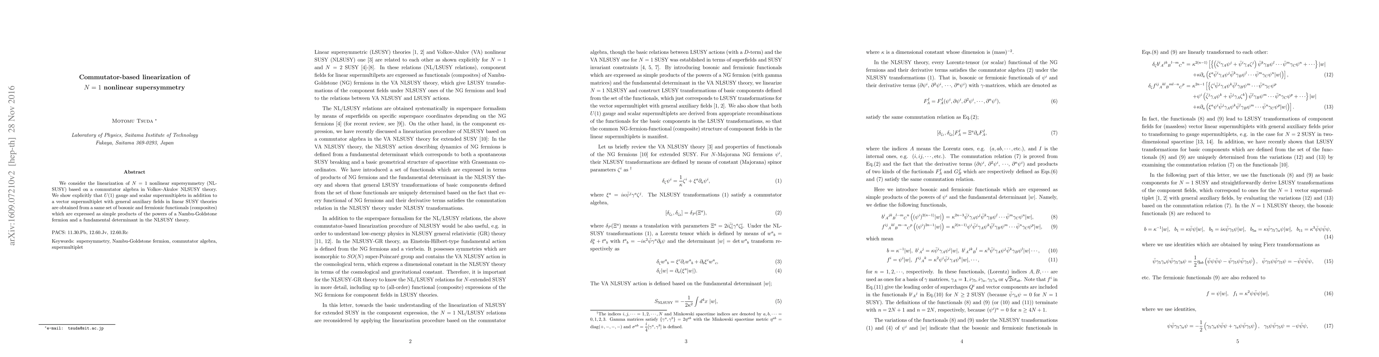 This paper demonstrates the linearization of $N = 1$ nonlinear supersymmetry (NLSUSY) via commutator algebra, revealing that $U(1)$ gauge and scalar supermultiplets, along with vector supermultiplets, can be derived from a unified set of bosonic and fermionic functionals based on Nambu-Goldstone fermions and a fundamental determinant.