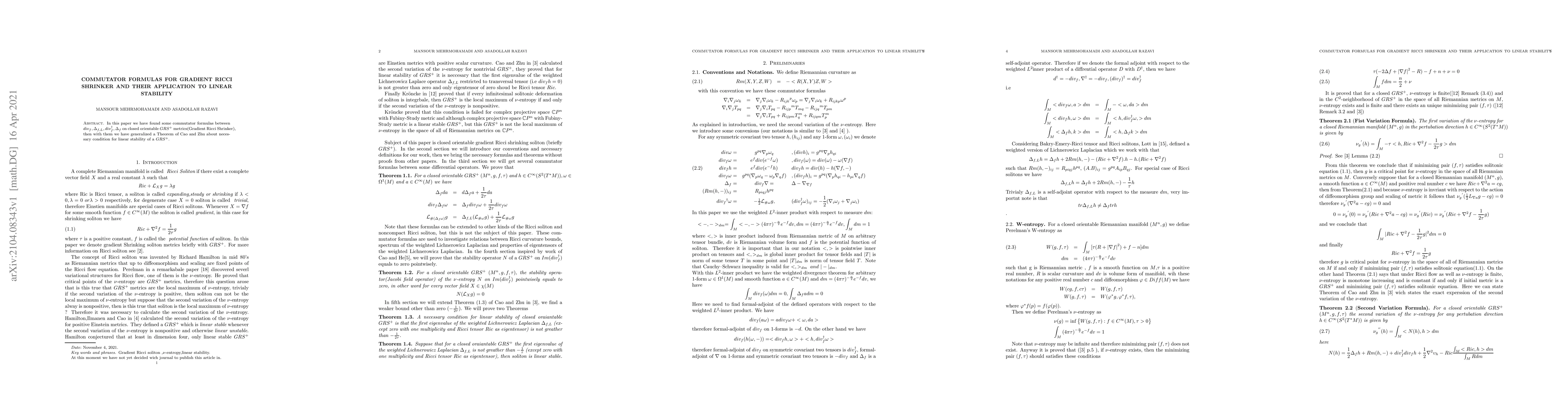 In this paper we have found some commutator formulas between $div_{f},\Delta_{f,L},div_{f}^\dagger,\Delta_{f}$ on closed orientable $GRS^+$ metrics (Gradient Ricci Shrinker), then with them we have generalized a Theorem of Cao and Zhu about necessary condition for linear stability of a $GRS^+$.