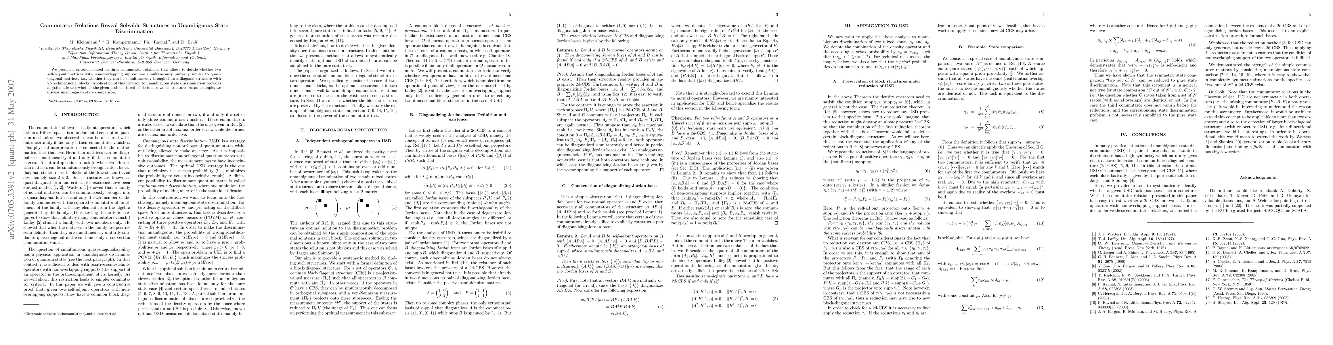 We present a criterion, based on three commutator relations, that allows to decide whether two self-adjoint matrices with non-overlapping support are simultaneously unitarily similar to quasidiagonal matrices, i.e., whether they can be simultaneously brought into a diagonal structure with 2x2-dimensional blocks. Application of this criterion to unambiguous state discrimination provides a systematic test whether the given problem is reducible to a solvable structure. As an example, we discuss unambiguous state comparison.