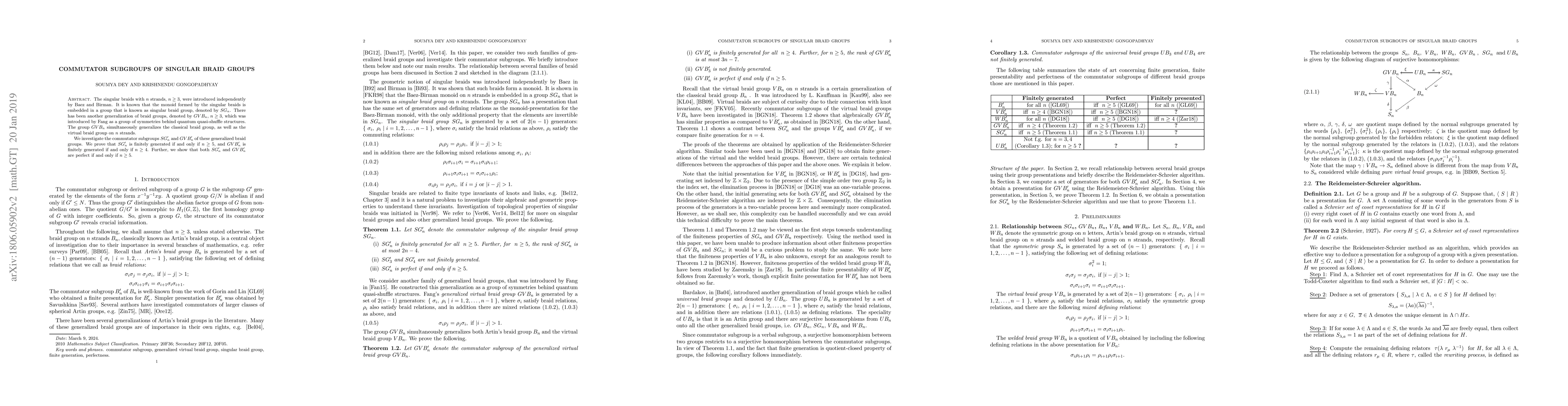 This research investigates the commutator subgroups of singular braid groups $SG_n'$ and $GVB_n'$, proving they are finitely generated for specific values of $n$ and showing they are perfect when $n \ge 5$.