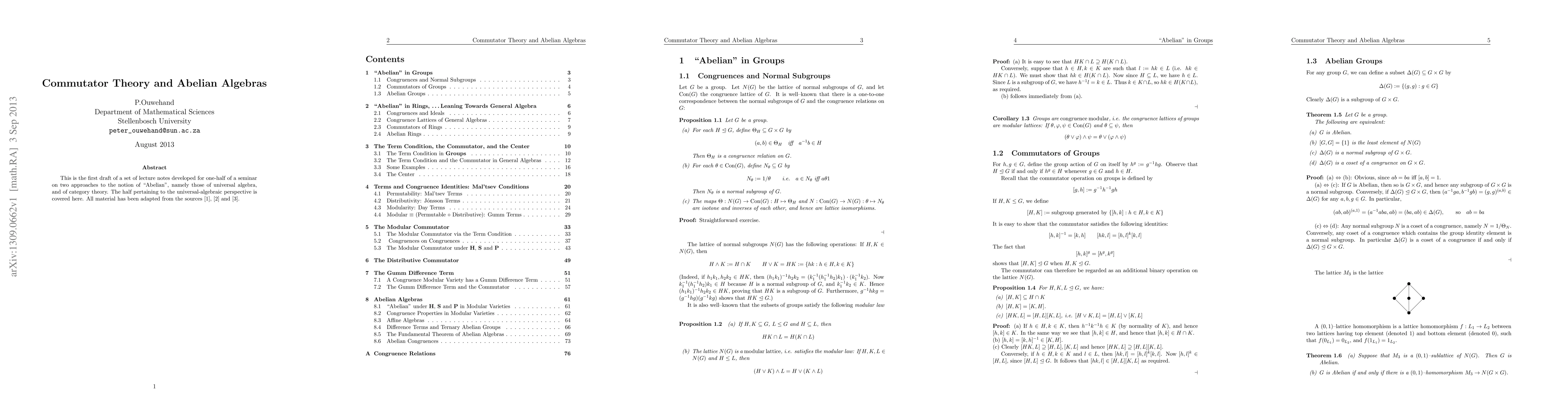 This is the first draft of a set of lecture notes developed for one-half of a seminar on two approaches to the notion of "Abelian", namely those of universal algebra, and of category theory. The half pertaining to the universal-algebraic perspective is covered here. All material has been adapted from the following sources: 1. Commutator Theory for Congruence Modular Varieties, by Ralph Freese and Ralph McKenzie. 2. Geometrical Methods in Congruence Modular Algebras, by H. Peter Gumm 3. Congruence Modular Varieties: Commutator Theory and Its Uses, by Ralph McKenzie and John Snow