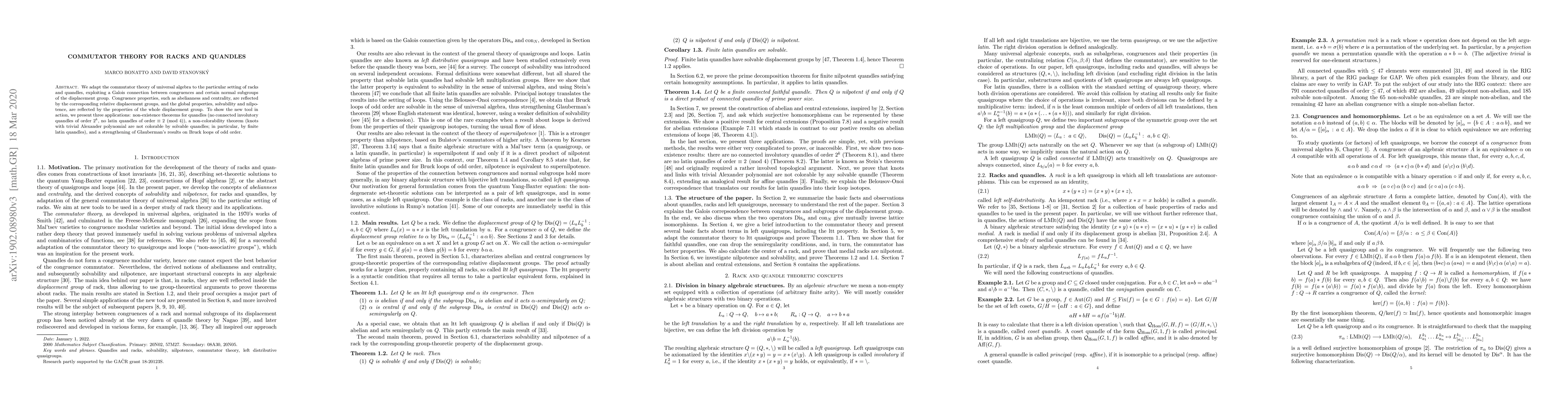 We adapt the commutator theory of universal algebra to the particular setting of racks and quandles, exploiting a Galois connection between congruences and certain normal subgroups of the displacement group. Congruence properties such as abelianness and centrality are reflected by the corresponding relative displacement groups, and so do the global properties, solvability and nilpotence. To show the new tool in action, we present three applications: non-existence theorems for quandles (no connected involutory quandles of order $2^k$, no latin quandles of order $\equiv2\pmod4$), a non-colorability theorem (knots with trivial Alexander polynomial are not colorable by latin quandles), and a strengthening of Glauberman's results on Bruck loops of odd order.