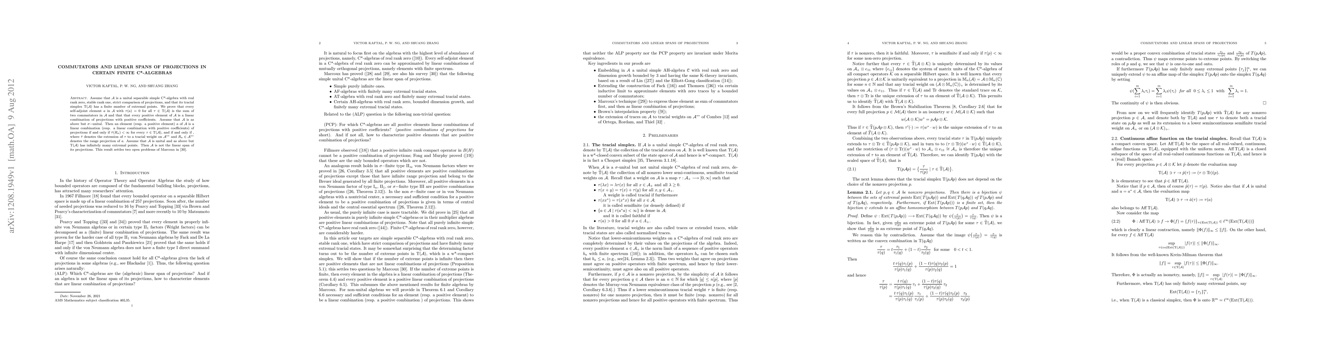 Assume that A is a unital separable simple C*-algebra with real rank zero, stable rank one, strict comparison of projections, and that its tracial simplex T(A) has a finite number of extremal points. We prove that every self-adjoint element a in A in the kernel of all tracial states is the sum of two commutators in A and that every positive element of A is a linear combination of projections with positive coefficients. Assume that A is as above but \sigma-unital. Then an element (resp. a positive element) a of A is a linear combination (resp. a linear combination with positive coefficients) of projections if and only if for all \tau in T(A), the extension \bar\tau to the enveloping von Neumann algebra has a finite value for the range projection of a. Assume that A is unital and as above but T(A) has infinitely many extremal points. Then A is not the linear span of its projections. This result settles two open problems of Marcoux.