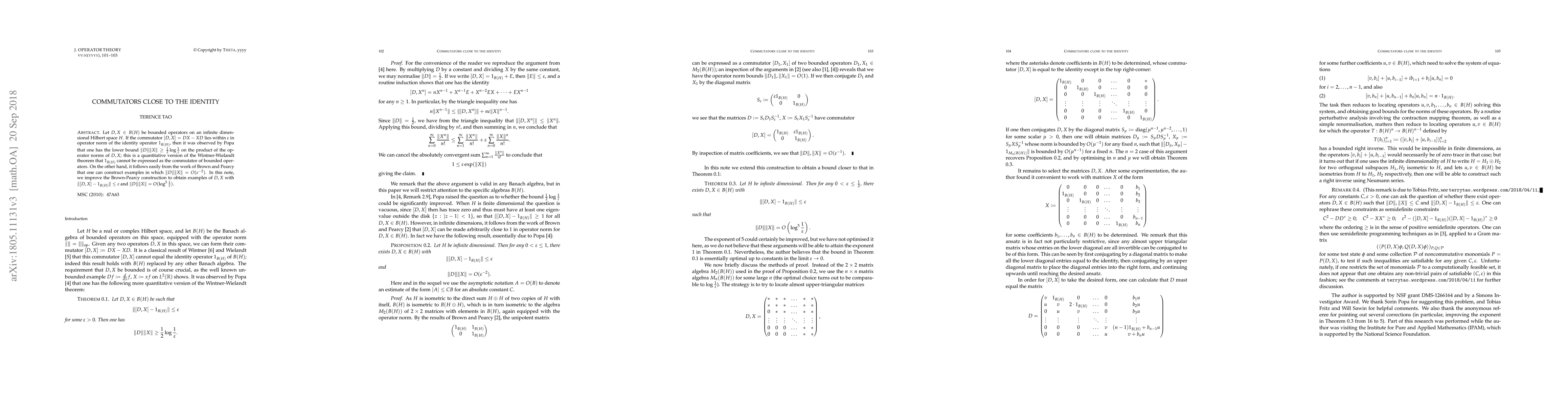 Let $D,X \in B(H)$ be bounded operators on an infinite dimensional Hilbert space $H$. If the commutator $[D,X] = DX-XD$ lies within $\varepsilon$ in operator norm of the identity operator $1_{B(H)}$, then it was observed by Popa that one has the lower bound $\| D \| \|X\| \geq \frac{1}{2} \log \frac{1}{\varepsilon}$ on the product of the operator norms of $D,X$; this is a quantitative version of the Wintner-Wielandt theorem that $1_{B(H)}$ cannot be expressed as the commutator of bounded operators. On the other hand, it follows easily from the work of Brown and Pearcy that one can construct examples in which $\|D\| \|X\| = O(\varepsilon^{-2})$. In this note, we improve the Brown-Pearcy construction to obtain examples of $D,X$ with $\| [D,X] - 1_{B(H)} \| \leq \varepsilon$ and $\| D\| \|X\| = O( \log^{5} \frac{1}{\varepsilon} )$.