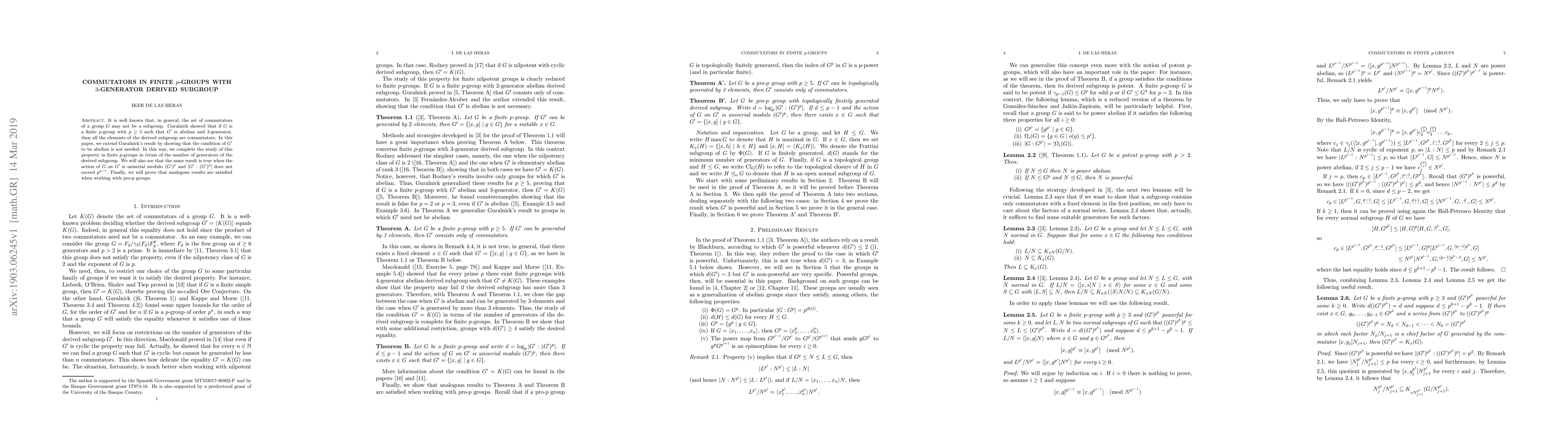 It is well known that, in general, the set of commutators of a group $G$ may not be a subgroup. Guralnick showed that if $G$ is a finite $p$-group with $p\ge 5$ such that $G'$ is abelian and $3$-generator, then all the elements of the derived subgroup are commutators. In this paper, we extend Guralnick's result by showing that the condition of $G'$ to be abelian is not needed. In this way, we complete the study of this property in finite $p$-groups in terms of the number of generators of the derived subgroup. We will also see that the same result is true when the action of $G$ on $G'$ is uniserial modulo $(G')^p$ and $|G':(G')^p|$ does not exceed $p^{p-1}$. Finally, we will prove that analogous results are satisfied when working with pro-$p$ groups.