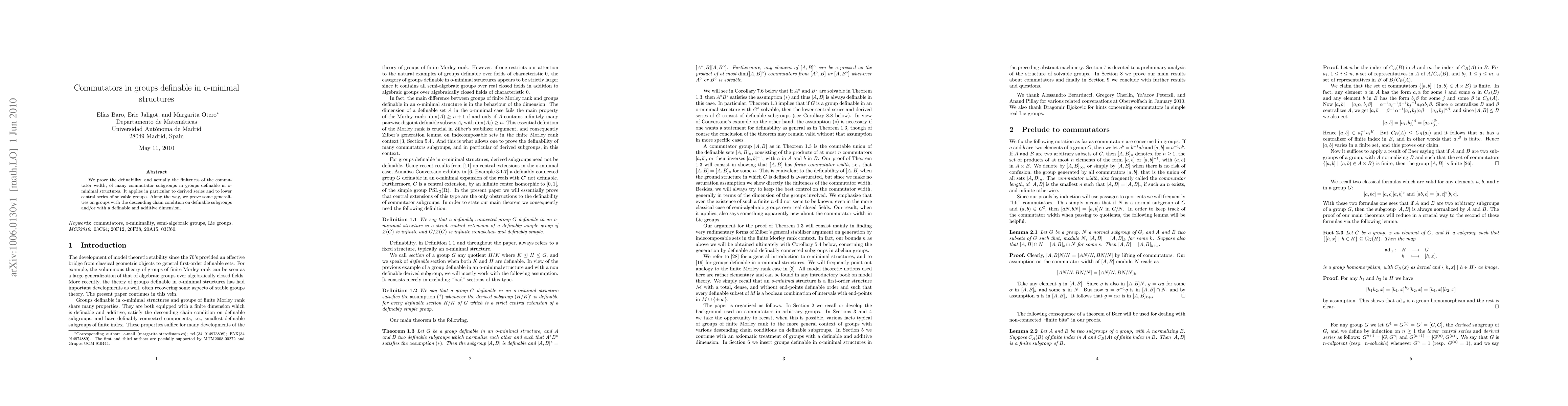 This paper demonstrates the finiteness of commutator width for groups definable in o-minimal structures, applying to derived and lower central series of solvable groups. It also establishes general properties for such groups with a descending chain condition on definable subgroups and additive dimension.