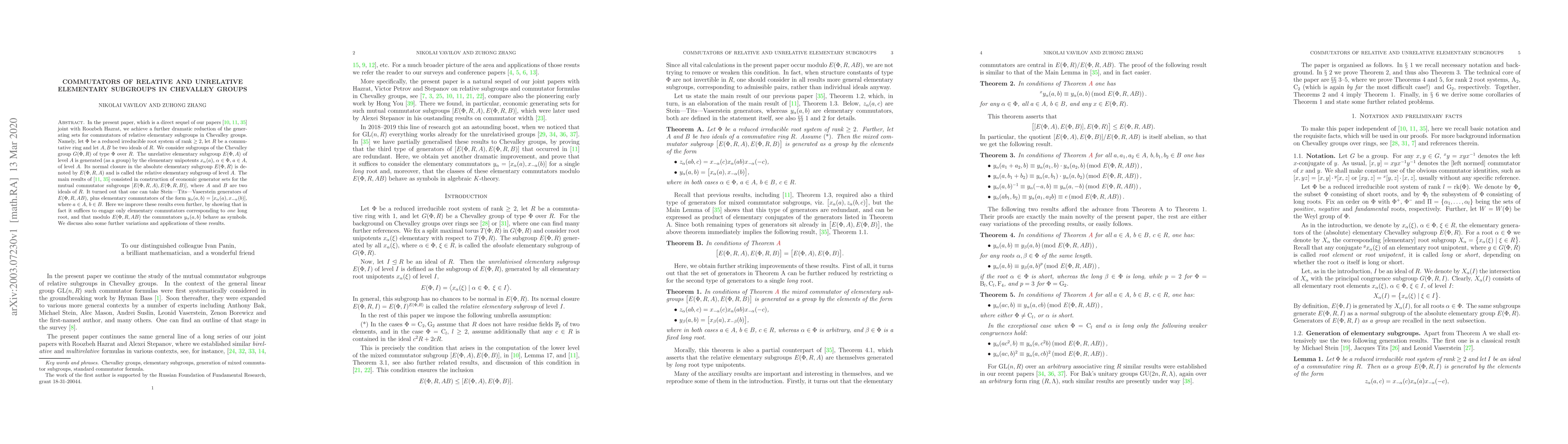 In the present paper, which is a direct sequel of our papers [10,11,35] joint with Roozbeh Hazrat, we achieve a further dramatic reduction of the generating sets for commutators of relative elementary subgroups in Chevalley groups. Namely, let $\Phi$ be a reduced irreducible root system of rank $\ge 2$, let $R$ be a commutative ring and let $A,B$ be two ideals of $R$. We consider subgroups of the Chevalley group $G(\Phi,R)$ of type $\Phi$ over $R$. The unrelative elementary subgroup $E(\Phi,A)$ of level $A$ is generated (as a group) by the elementary unipotents $x_{\alpha}(a)$, $\alpha\in\Phi$, $a\in A$, of level $A$. Its normal closure in the absolute elementary subgroup $E(\Phi,R)$ is denoted by $E(\Phi,R,A)$ and is called the relative elementary subgroup of level $A$. The main results of [11,35] consisted in construction of economic generator sets for the mutual commutator subgroups $[E(\Phi,R,A),E(\Phi,R,B)]$, where $A$ and $B$ are two ideals of $R$. It turned out that one can take Stein---Tits---Vaserstein generators of $E(\Phi,R,AB)$, plus elementary commutators of the form $y_{\alpha}(a,b)=[x_{\alpha}(a),x_{-\alpha}(b)]$, where $a\in A$, $b\in B$. Here we improve these results even further, by showing that in fact it suffices to engage only elementary commutators corresponding to {\it one\/} long root, and that modulo $E(\Phi,R,AB)$ the commutators $y_{\alpha}(a,b)$ behave as symbols. We discuss also some further variations and applications of these results.